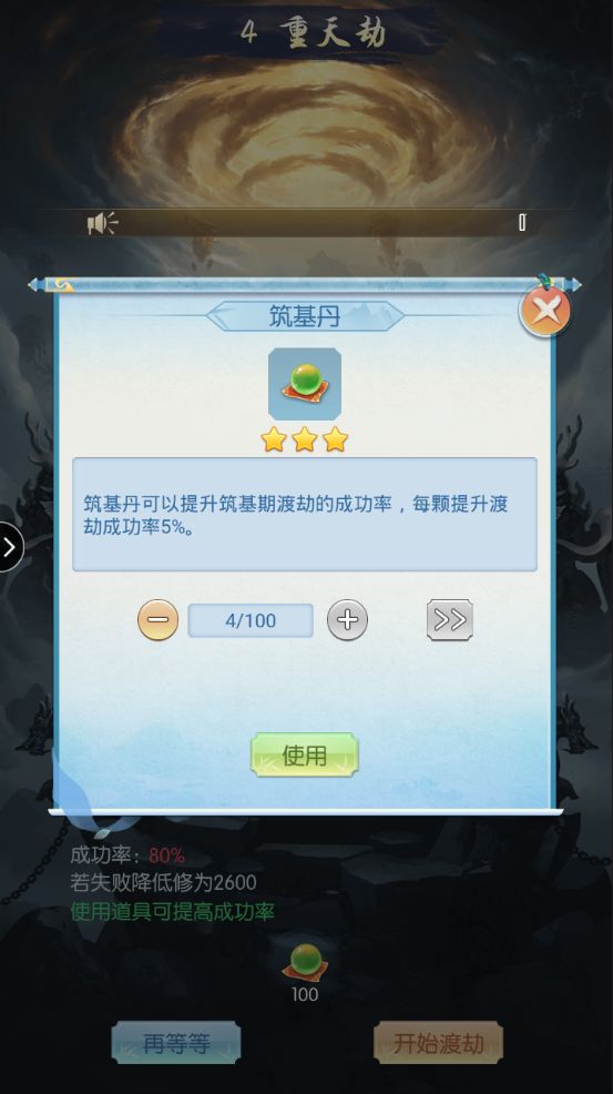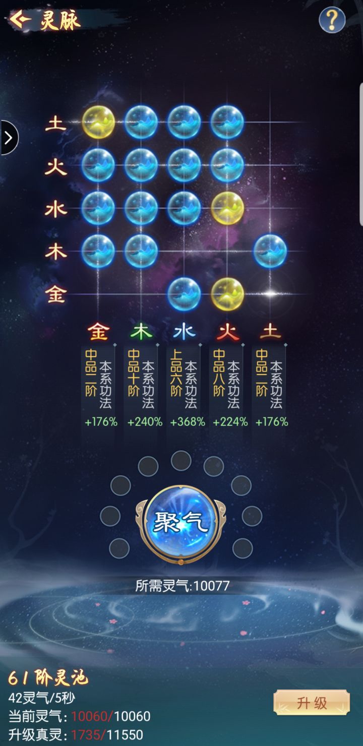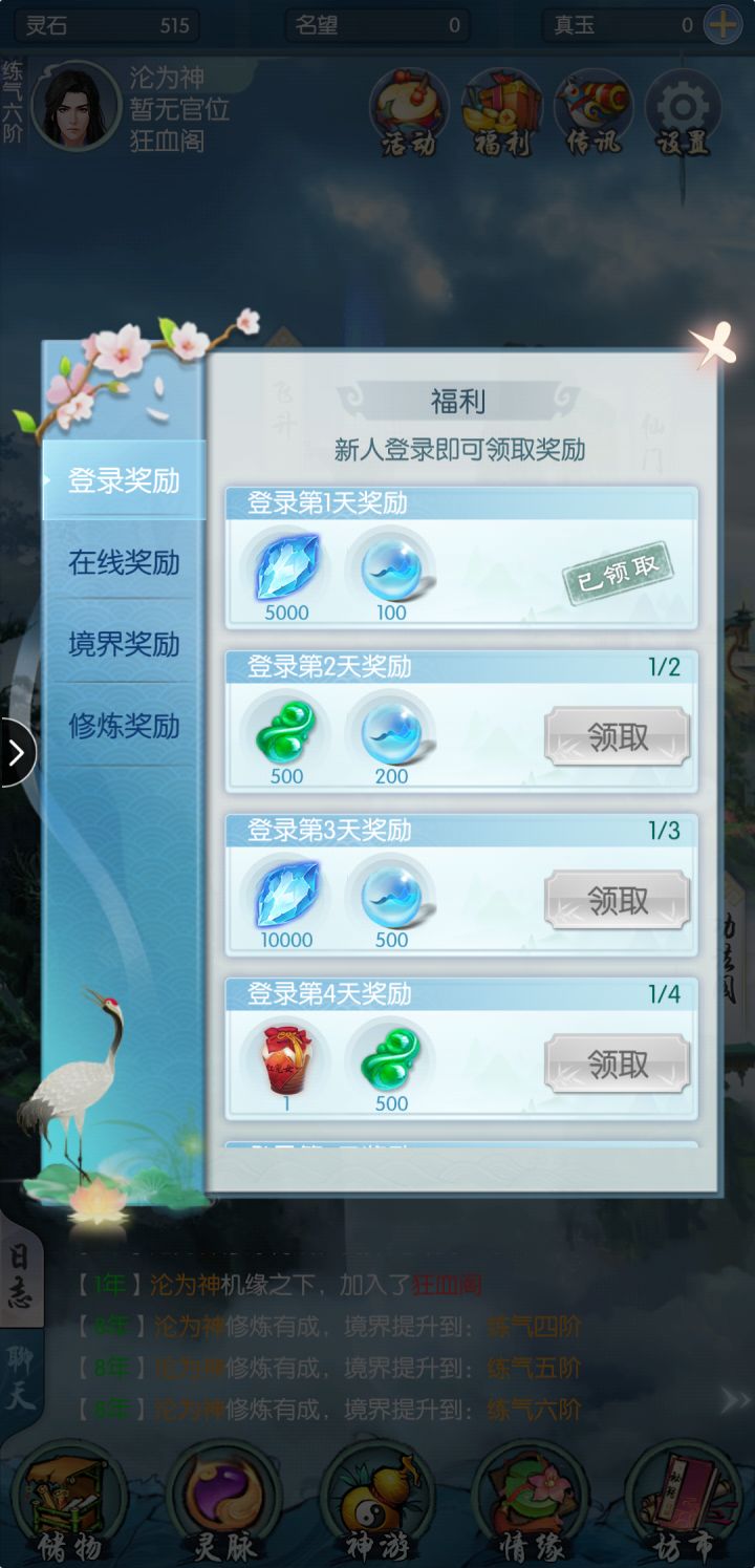 一、渡劫:打坐可获取修为,当修为满足后即可进行渡劫,渡劫有一定成功率,失败时会扣除部分修为,但通过丹药可提升渡劫成功率,顺利渡劫后则可提升境界等级,开放更多功能玩法。二、淬体:通过神游获得气力值后可淬体提升肉体等级,肉体等级越高,角色防御属性越强,战斗时概率获得的‘金钟罩’护盾值越高。三、灵脉:灵脉等级越高产生灵气的速率越快,可储存的灵气上限也越高,灵气可以用来提升灵根及仙法等级,使仙法所加属
