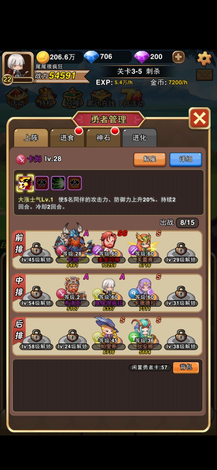 玩了一天过一点,脸太黑的原因,抽了无数次,木得ss。论没ss如何战力搞上去,1进化,2羁绊,3符文,符文这个东西太费金币,不过提升的效果也是杠杠的。4所有角色能升级的就升级,神石能给的就给。解雇全部返还。羁绊上场,上这种收集完的,玩了这些时间发现了一些问题,那就是最好的提升战力抽卡,抽卡,抽卡,重要的事情说3遍,唯一的一点就是低级卡可以合成高级卡在工坊里面,目前来说只有这么点信息,
