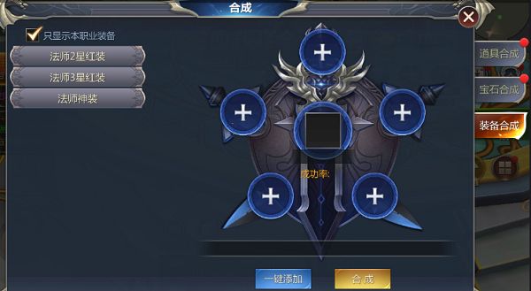 装备合成是玩家获取神装的必经之路,装备合成功能于人物等级达到230级时开启,首先会开启5-8阶红装合成,9阶和10阶以上红装合成开启等级由勇士们自己在游戏内体验发发掘~合成规则说明:以5阶装备的合成为例,5阶红色2星装备的合成由3-5件5阶橙色2星的装备合成,其中3件合成成功率为70%,4件成功率为85%,5件成功率为100%例如上图中,合成5阶红2星的武器,则需要3-5件本职业的5阶橙色2