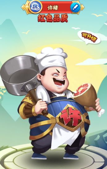 【红将-许褚】简介——曹魏集团首席厨师长,厨艺出神入化,一手铁锅炖鸡腿深得曹老板的喜爱。样貌敦厚,为人平和。爱用平底锅解决一切不满意的事情。技能——普攻:对敌方单体造成100%攻击的伤害怒攻:对敌方全体造成90%攻击的伤害,10%概率使其眩晕1回合突破天赋——亲爱的主公,如想获取更多游戏动态及活动官方福利礼包,请加入Q群或者微信客服~群名称:天天三国官方交流群QQ群:672656