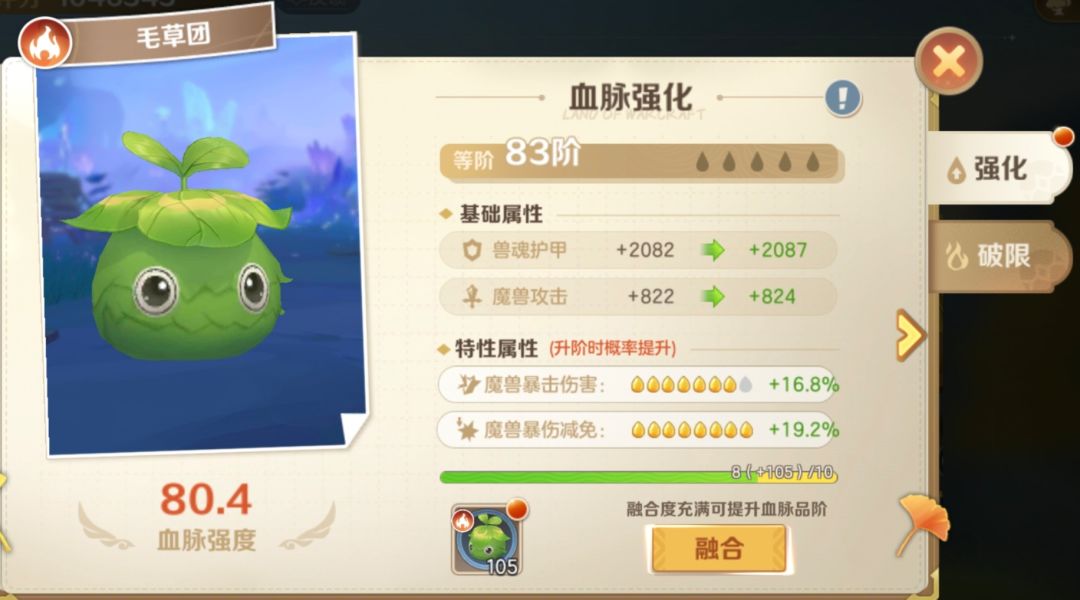 小伙伴们大家好,现在抓魔兽已经减负一段时间了,每天最多只能抓两个闪异魔兽和 20 个异色以下魔兽,魔兽栏魔兽堆积太多,什么魔兽有用什么魔兽没用看起来十分繁琐,今天想跟大家讲讲魔兽资源的有序消耗和整理建议,直接讲重点。 目前魔兽消耗和轮动主要有两个方面: 第一是血脉强化,血脉强化的第一要务是先升满特性属性,这个特性属性是血脉强化等阶升级时小概率突破,如果是一阶一阶去突破想升级特性属性几率是非常低的,