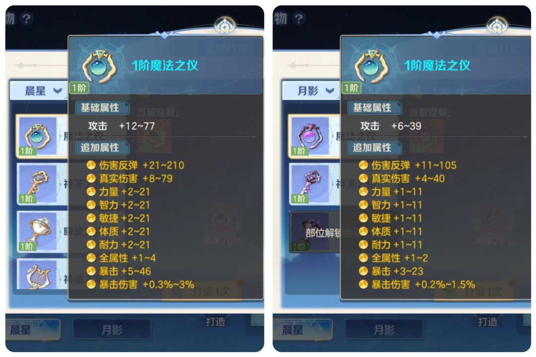 小伙伴们大家好,圣物前阵子开启了新的篇章,月影圣坛开启,圣物迎来了第二套养成,属性又会迎来一定幅度的提升,今天跟大家讲讲月影圣坛圣物的养成建议。 首先第二套月影圣物跟第一套晨星圣物还是一个机制从第一阶开始打造,然后跟着工会月影圣坛的等级同步提升,所以说第二套月影圣物想提升到第一套晨星圣物 6 阶满级这中间需要好几个月的时间。 我们对比晨星圣物和月影圣物的属性情况,第二套月影圣物的属性上限是第一套晨