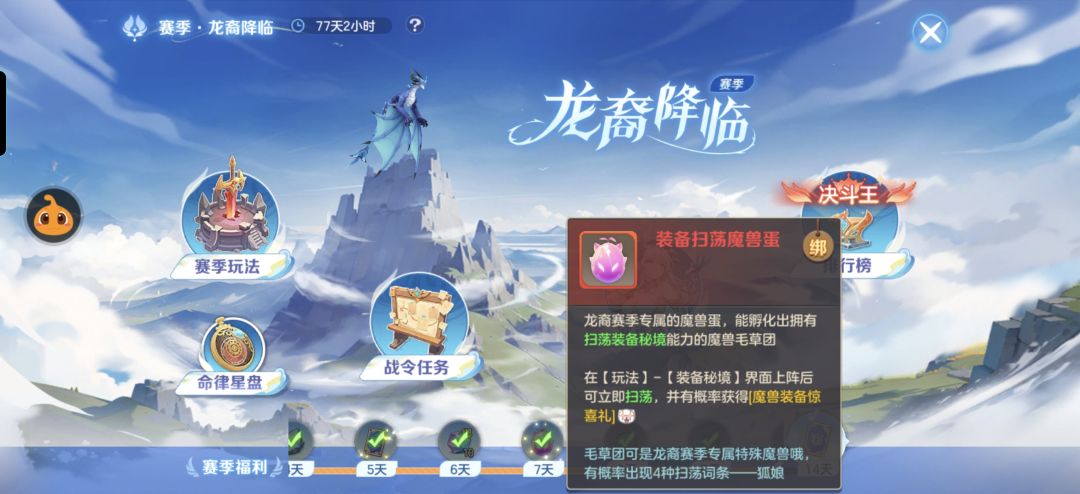 小伙伴们大家好,龙裔赛季开放以后再玩法活动中多了几个不一样的东西,那就是龙裔赛季专属特殊魔兽,今天就跟大家讲讲赛季专属特殊魔兽的运用。 当前龙裔赛季专属特殊魔兽是毛草团子,毛草团目前有几率开出四种扫荡词条,目前赛季签到七天会获得第一只闪异品质装备扫荡词条的毛草团。 除此以外,我们在野外抓的毛草团随机概率会出现四种类型的扫荡词条,根据毛草团的品级不同,扫荡词条的效果也会有一定的差异。 目前毛草团扫荡