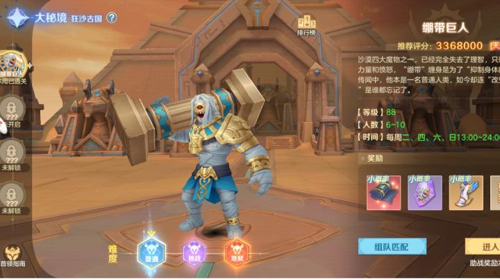 小伙伴们大家好,这几天云上城之歌迎来了2.0全新大版本,2.0版本带来了很多新玩法以及新职业,今天我就跟大家详细解析大秘境狂沙古国十人团队副本的玩法。首先这个团队一共有三个难度的版本:普通、挑战以及地狱级难度,其中地狱级难度副本有开荒模式,开荒模式初始难度250%,难度在副本挑战期间内每隔3小时会衰减10%,肯定会有小伙伴会比较好奇,开荒有挑战性吗?这么跟你说吧,官方指定的地狱级难度战力要求是神
