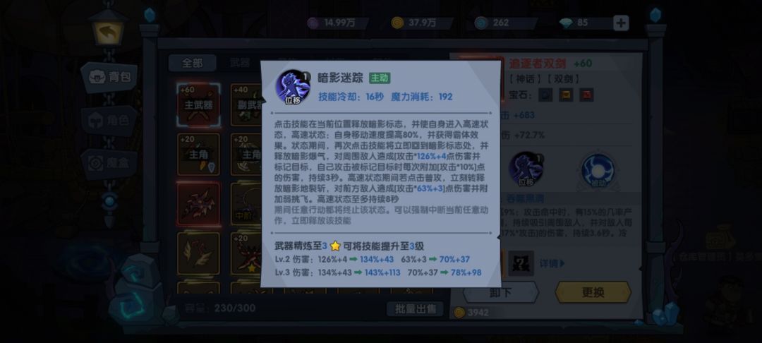 双刀副技能推荐(个人理解推图向) 个人最推荐暗影迷踪 理由当然是帅啊,拜托~暗影附身冲刺超帅的好吧……咳咳,开个玩笑,因为它作为辅助技能,非常实用,主要作用有: 1、拉扯。开了技能速度提升,跑就完事了,还可以换位。 2、一刀弱浮空。我认为算一个小硬控,虽然对boos和有盾的怪没用,但是可以浮空魔化怪,没错!!就是那种最恶心的脚下有红圈的怪,从砍了到怪物起身,是够砍一套剑舞的。 3、爆气有打断。爆气可以打断boos的部分技能。(ps: boos在标记点附近才能炸到,可以两次点按打断,如果贪伤害也可以贴脸砍一刀再爆气) 综上所述,暗影迷踪结合拉扯、小硬控、打断于一体,是最合适的副手技能。