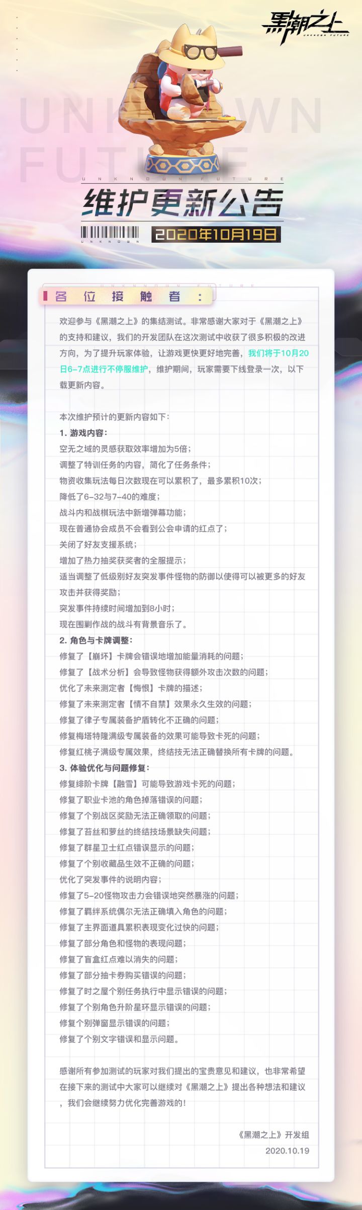 各位接触者,欢迎参与《黑潮之上》的「集结」测试。非常感谢大家对于《黑潮之上》的支持和建议,我们的开发团队在这次测试中收获了很多积极的改进方向。为了提升接触者体验,让游戏更快更好地完善,我们将于10月20日6-7点进行不停服维护,维护期间,接触者需要下线登录一次,以下载更新内容。请点击长图获取详细更新公告。游戏最新资讯、游戏福利礼包、游戏问题和建议反馈都在这里!官方交流群:822421031官