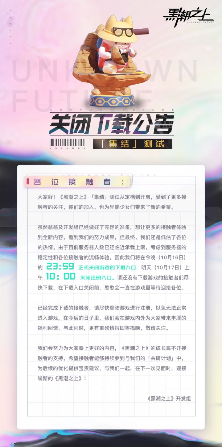 由于目前服务器人数已经临近承载上限,考虑到服务器的稳定性和各位接触者的流畅体验,因此我们将在今晚(10月16日)的23:59正式关闭游戏的下载入口,明天(10月17日)上午10:00关闭注册入口。请还没有下载游戏的接触者们尽快下载,在下载入口关闭前,憨憨会一直在游戏里等待迎接各位。点击下方长图,获取「集结」测试关闭下载公告详细内容。游戏最新资讯、游戏福利礼包、游戏问题和建议反馈都在这里!官方交