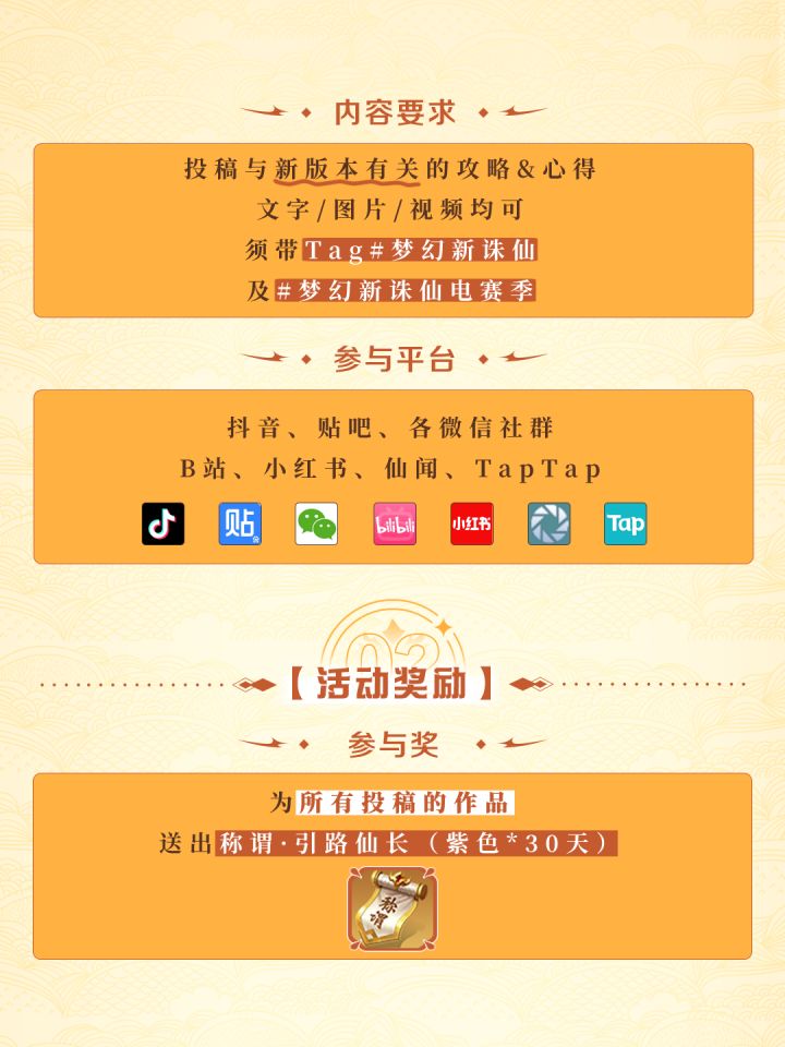 相信已经有不少道友体验过“闪电链”+“万剑流”炸翻全场了!那么你有没有什么独门秘籍可以分享呢?小梦诚邀全神州浩土的道友分享新版本的攻略心得,投稿就能获得称谓·引路仙长,被官方收录更有门派立牌、盲盒手办、三周年礼盒等精美周边哦! 参与方式和奖励内容详见下方长图捏!!!o(´^`)o#梦幻新诛