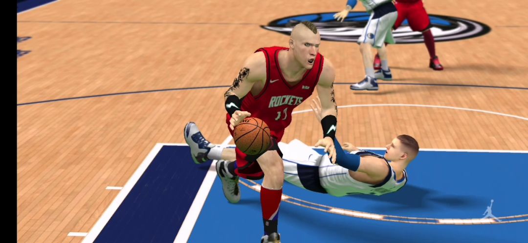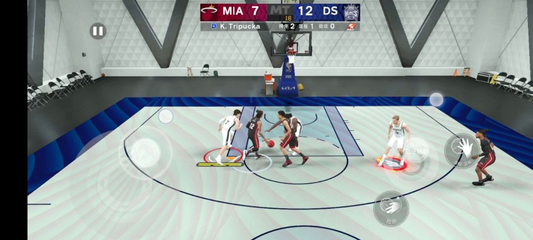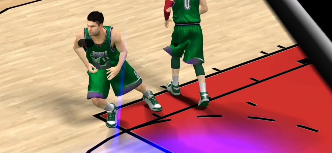 这次按早了一步,最佳时机是到小弧线的边按投篮这样就是隔扣了。 不用什么交叉步的直接撞过去,但必须要快尤其下半场电脑喜欢包夹。