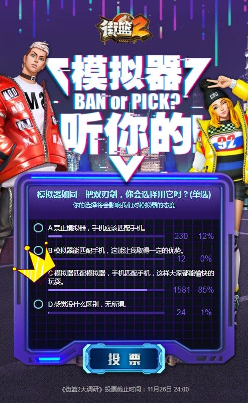 哈喽~大家好!我是球哥,那枚球场上最酷的仔~今天,球哥要公布上周《街篮2大调研》的结果,虽然事先赶jio会有很多人冲着奖品而来,但实际情况让球哥感到欣慰,无论评论区言辞再激励,再争锋相对,都是为了得到更好的体验。下面直接上结果:投票结果以“C-模拟器手机分开”取得最高票数的支持!投票主要来自《街篮2》TapTap社区和微信公众号-《街篮2》最早一批的核心玩家,你们的建议是很具有参考价值的。虽