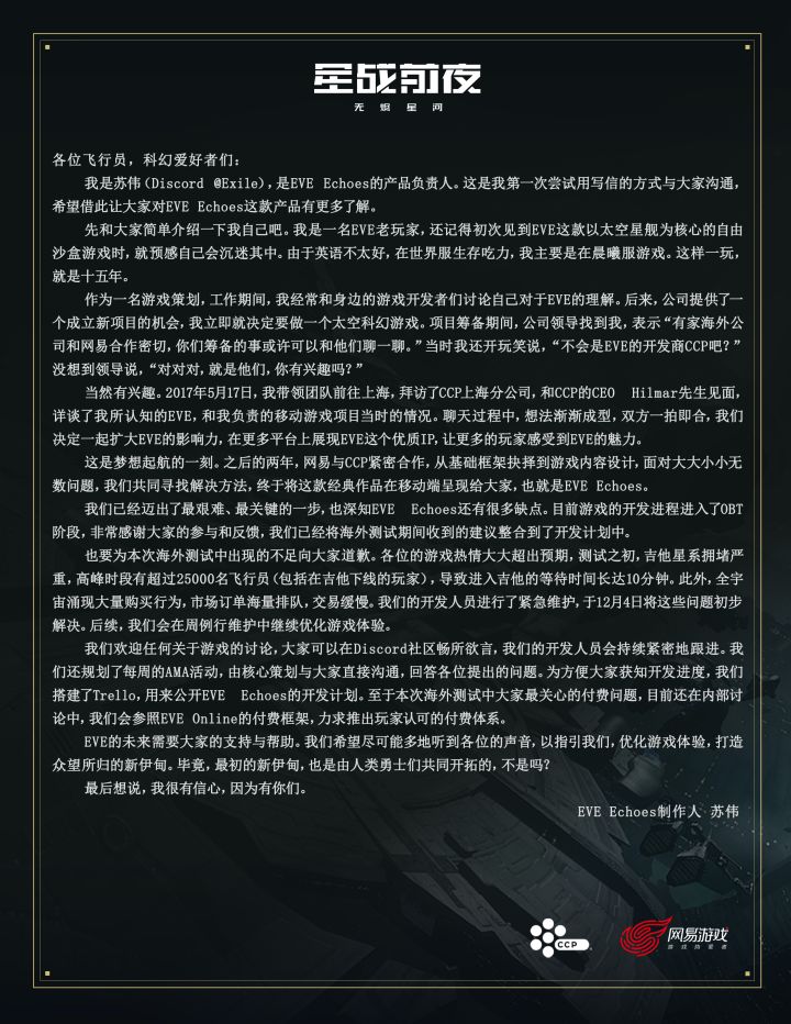 飞行员,您有一封来自EVE Echoes制作人的信,烦请查收!