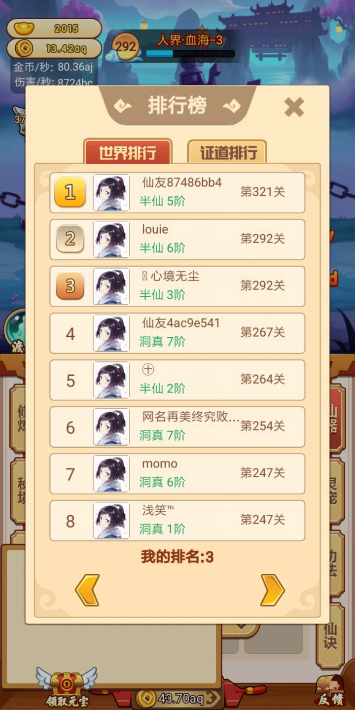 核心:广告!!!CDK88888888-有限广告(次数限制):元宝5次共150元宝,金钱10次不固定(大概率看闯关数或武器等级),秘境行动力3次共60点行动力,占卜5次共25次转盘,宗门心法灵气池开上限2次,宗门任务刷新3次。-无限广告(出现就能看):离线收益广告,武器跳级广告,渡劫丹药广告,灵气双倍修炼广告。①境界。修炼需要手点,初始一小时一次,可修炼功法+修炼时长/修炼效率/修炼上