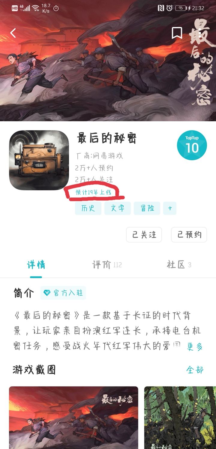 真的很希望这个游戏能上线,看评论里有人19年就在预约这个游戏了。这个题材真的很喜欢,网易这一次良心点吧,把这个游戏弄出来,真的很喜欢#最后的秘密