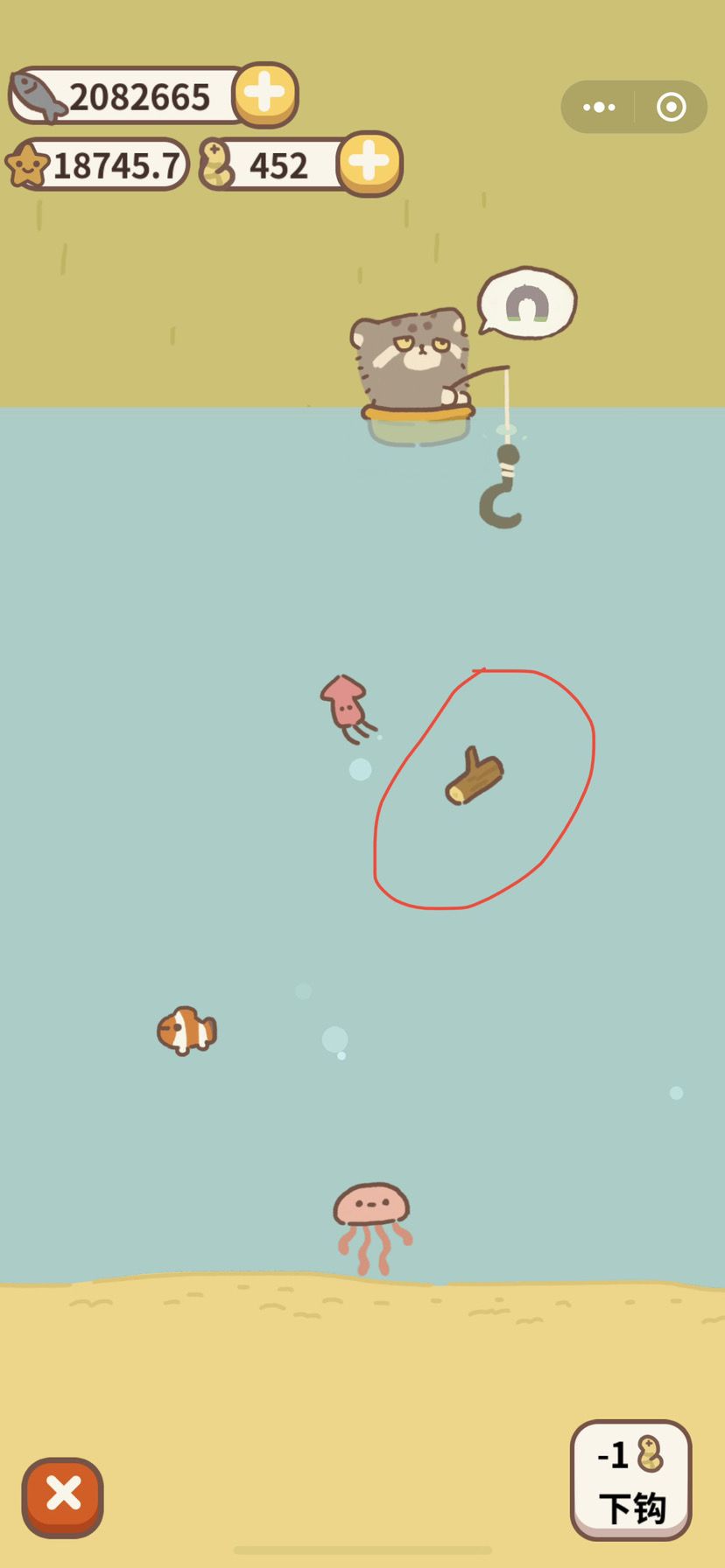 莫名其妙下突然摸到了一点点诀窍,如果你跟我一样老估算不好下勾位置,真的可以试一下,刷到这种小树枝处在图中这个位置,螃蟹从右边过来,你在小树枝左侧下勾,真百分百抓到螃蟹!!!