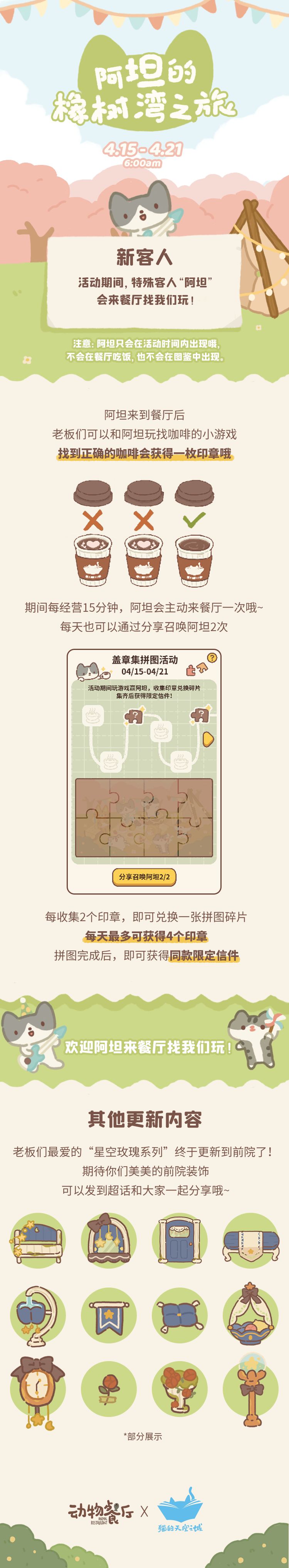 1. 61限定家具明天后将无法购买。 2.版本7.8更新(版本号9.5.13),本次加入了三封信和夏日有关的设施。 3.微信小程序内“咕咪的百宝箱”中出现的“优惠券”等内容,将于本周五7月15日停止服务。 动餐快报每周四更新 关注我!!! TapTap:@爱玩动物餐厅的屑 哔哩哔哩:@爱玩动物餐厅的屑