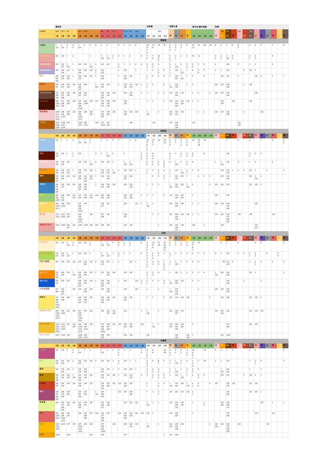 其实想做这个很久了,因为一直都觉得外卖商店的进货价飘忽不定,所以决定长期统计出现的各种“商品-价格”组合,很容易就发现同一个商品用同一种货币购买可能有多个价格。目前基本上还是可以看出一些趋势(e.g. 1级向日葵≈2级小雏菊)。总之以后会时不时更新一下,添加新的数据,也欢迎大家总结规律。 至于这个图要怎么读:每一列代表固定的花/花园工具/水产(四种季节花等价),颜色我都标得挺明显的,应该不会出现看