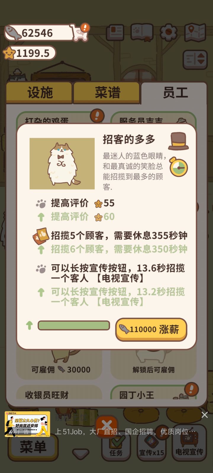 前期鱼干收益最高的两个地方毋庸置疑小费和自助餐厅但是她们都需要加一个特定小费需要看广告领双倍而自助餐厅需要招好友来自己家打工一个好友增加百分之十收益最多三个也就是最多百分之三十的加成另外游戏可以慢节奏玩儿不用赶着走再一个购买前可以注意一下鱼干收益不是贵的就是好的(每个家具的收益都是会叠加的只要购买了就会叠加滋好比桌子有六个一号桌买了五个就是叠加五个二号桌买了三个就叠加三个