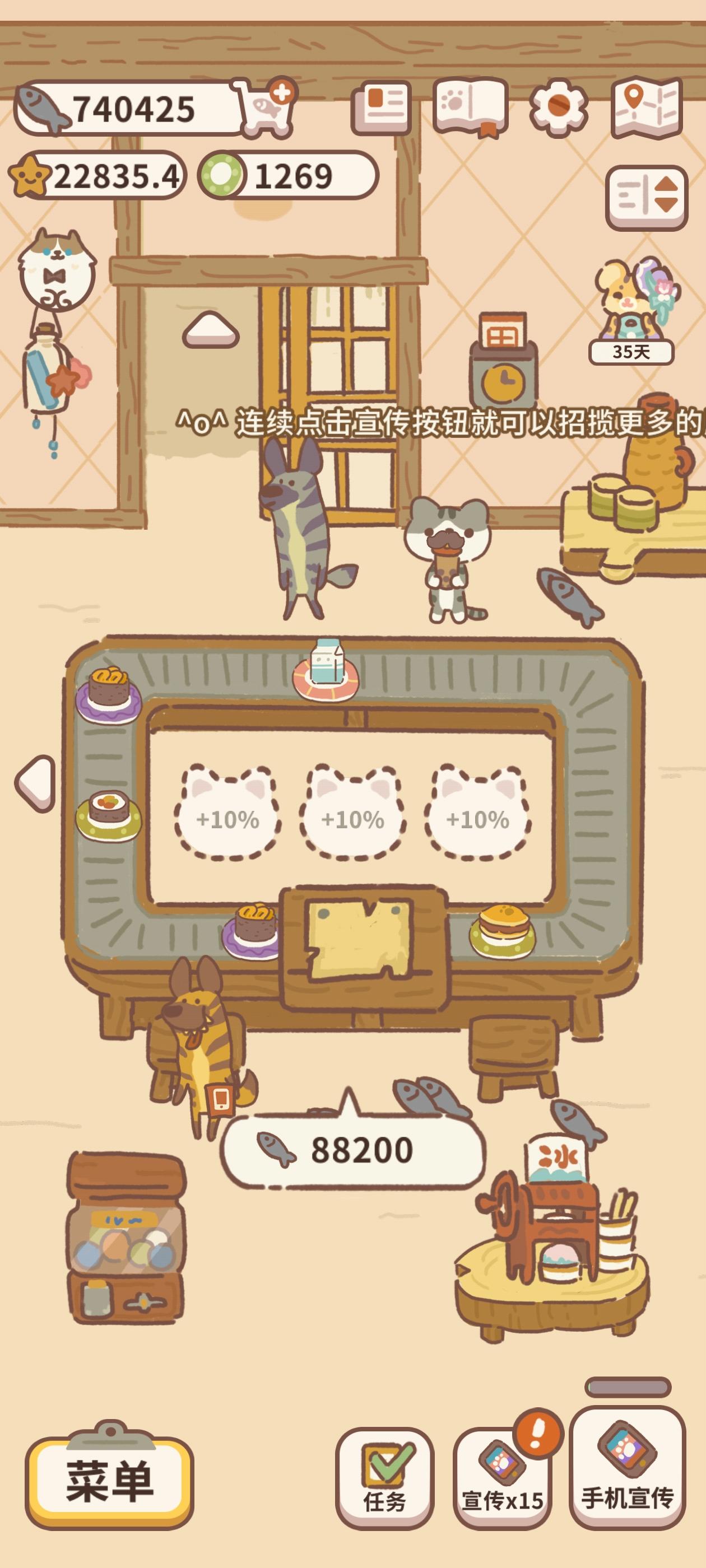 前期鱼干收益最高的两个地方毋庸置疑小费和自助餐厅但是她们都需要加一个特定小费需要看广告领双倍而自助餐厅需要招好友来自己家打工一个好友增加百分之十收益最多三个也就是最多百分之三十的加成另外游戏可以慢节奏玩儿不用赶着走再一个购买前可以注意一下鱼干收益不是贵的就是好的(每个家具的收益都是会叠加的只要购买了就会叠加滋好比桌子有六个一号桌买了五个就是叠加五个二号桌买了三个就叠加三个