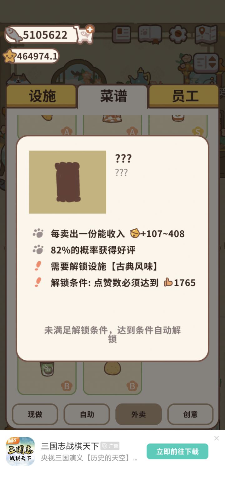 这是啥情况谁能帮帮我!!!我本来要解锁自助餐厅,结果刚点了一下解锁的按钮就变成这样了,我重启了,删了重新下都没有用!!(ps:我已经到达所需的评价星数和小鱼干)