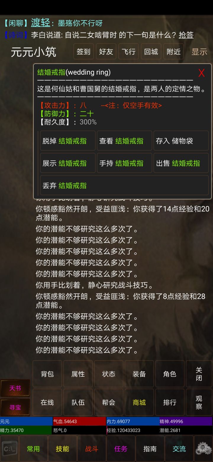 毕竟MUD类型游戏太开放了,新手上来通常会懵逼一下,下面总结一些常见问题,以供参考,若有其他问题,欢迎跟帖,我们会陆续添加进来。1.气血怎么提升气血受内力精力影响,冲带脉也能提高气血。如果内力高了气血还没高,请quit刷新一下。2.关于内力精力问题以内力为例,有当前内力,内力上限,内力极限的区别,属性里的内力左边是当前内力,右边是内力上限,精力同理。内精极限左边是内力极限,右边精力极限。提