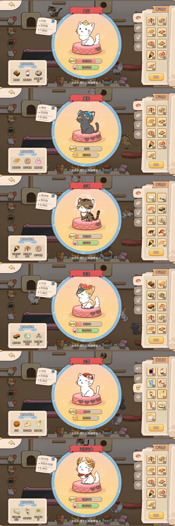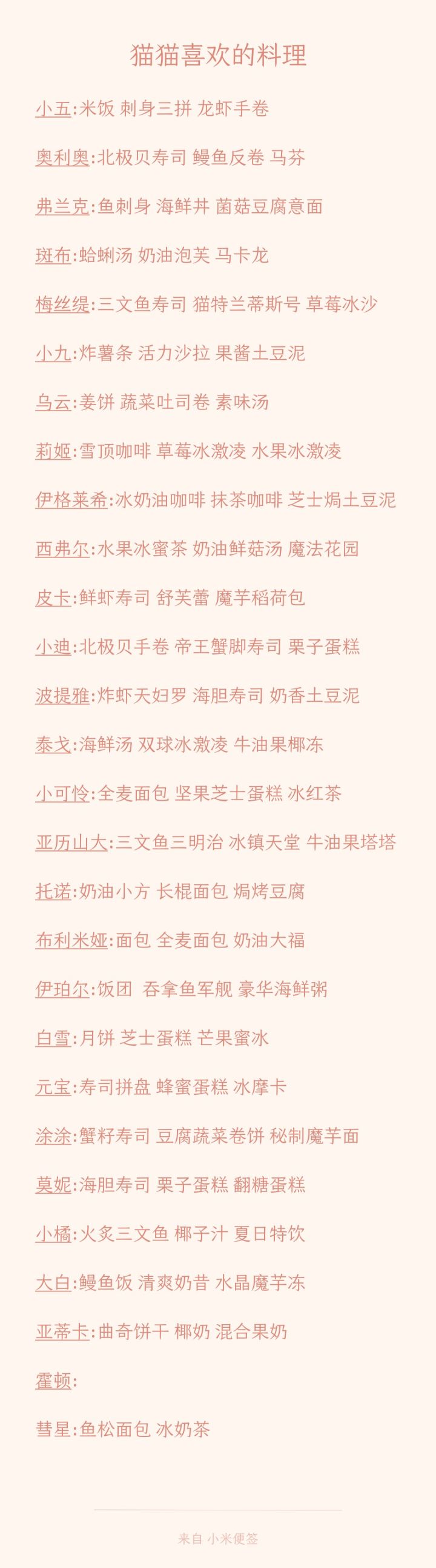 猫咪喜欢吃的食物:小五: 米饭 刺身三拼 龙虾手卷梅丝缇:三文鱼寿司 猫特兰蒂斯号斑布: ***蜊汤 奶油泡芙奥利奥:北极贝寿司 鳗鱼反转 马芬弗兰克:鱼刺身 海鲜丼伊玻尔:饭团 吞拿鱼寿司 豪华海鲜粥小迪:北极贝手卷 帝王蟹脚寿司 栗子蛋糕波提雅:炸虾天妇罗 海胆寿司小橘:火炙三文鱼 椰子汁布里米娅:面包 全麦面包皮卡:鲜虾寿司泰戈:海鲜汤 双球冰激凌元宝:寿