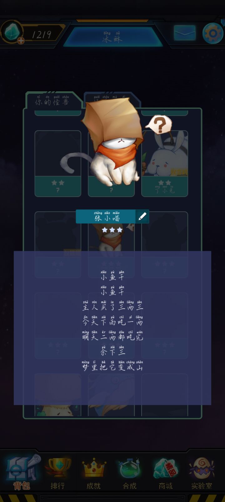每次孵化完成最期待的就是看到小怪兽的可爱语录了但现在连登录都登不进去了呜呜呜。之前因为未成年限制进不去加上高三卸载了一段时间,今天翻相册看到想回来再下一次就没有了呜呜呜(┯_┯)有没有存了图鉴的大佬救救孩子(这个taptap还是为了下你下回来的,戒游好长时间了)