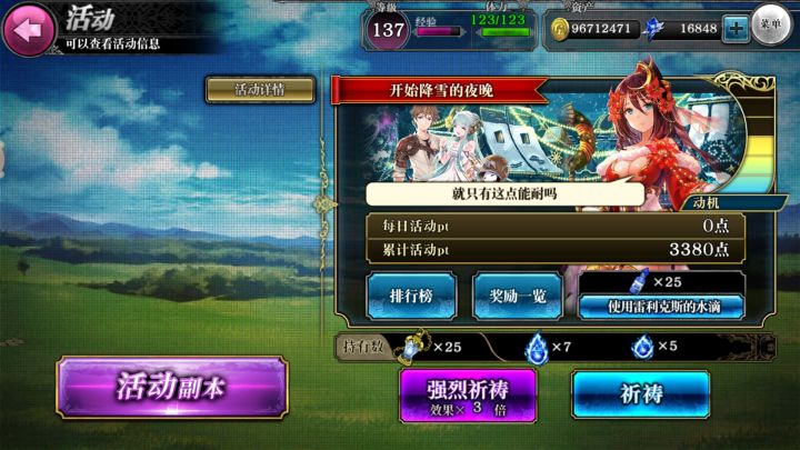 一 活动条例:※活动期间,活动副本会开「初级」「中级」「高级」「超级」。※每次通关活动副本可获得「活动点」。※通关活动副本可能获得「灵魂碎片」「灵魂结晶」 。※「灵魂碎片」「灵魂结晶」的持有上限为各999个。*消耗「灵魂碎片」「灵 魂结晶」在活动页面上进行「祈祷」「强力祈祷」 的话,可获得更多活动点。※使用「强力祈祷」需要「发光的小瓶子」。*通过「祈祷」「强力祈祷」 得到的活动点,根
