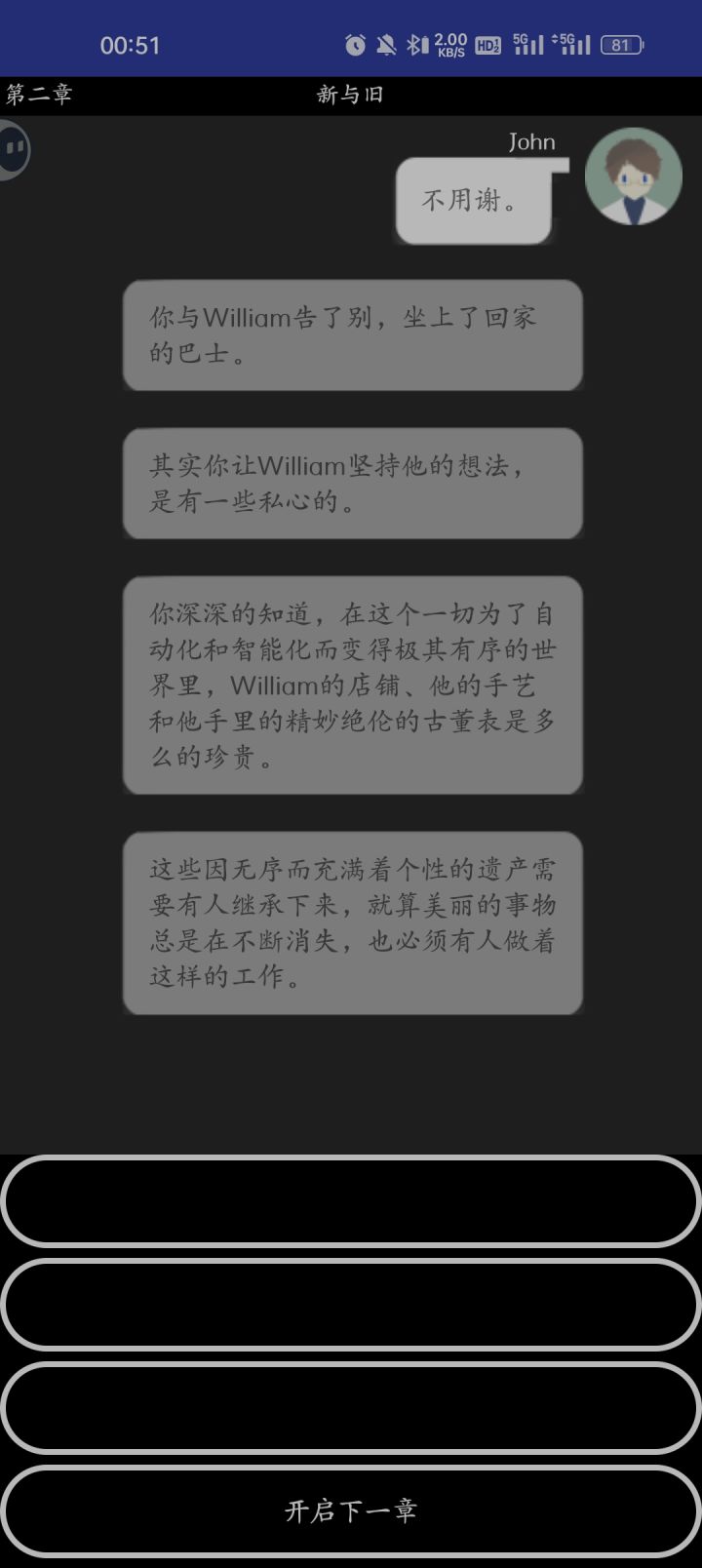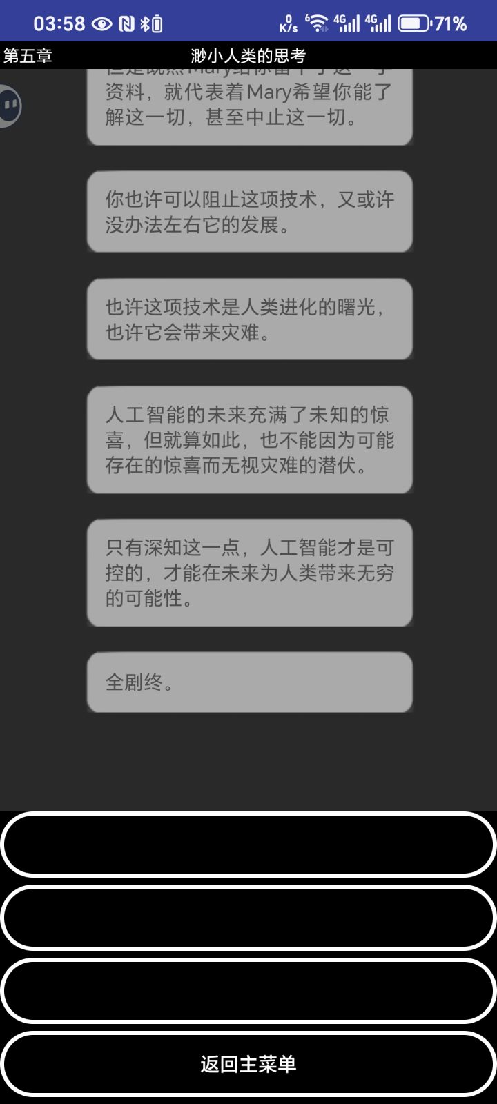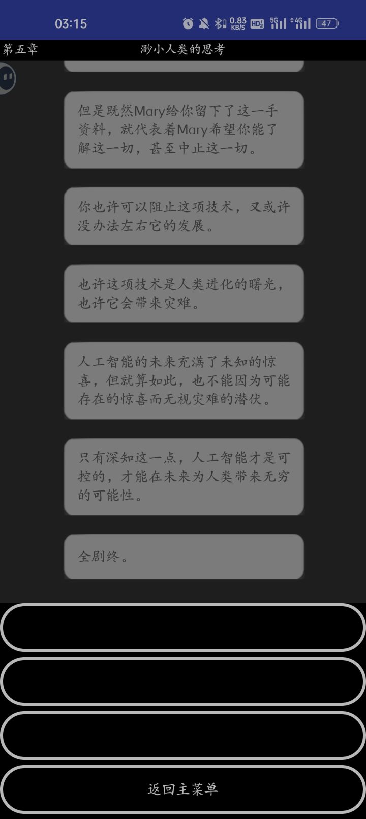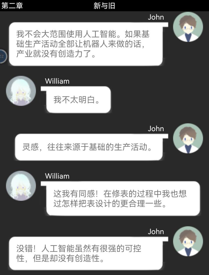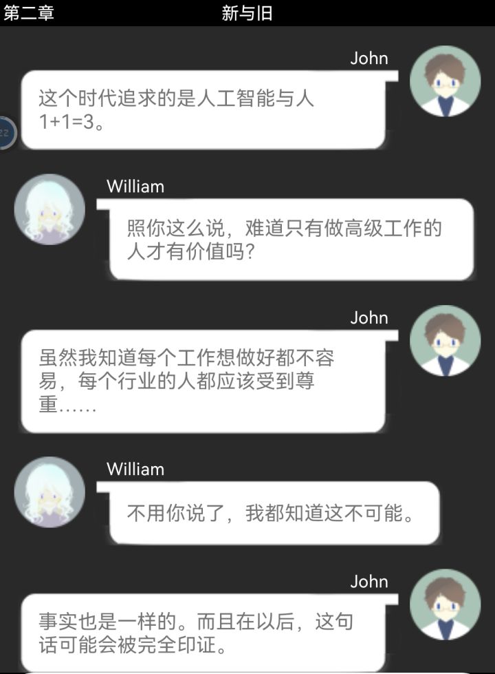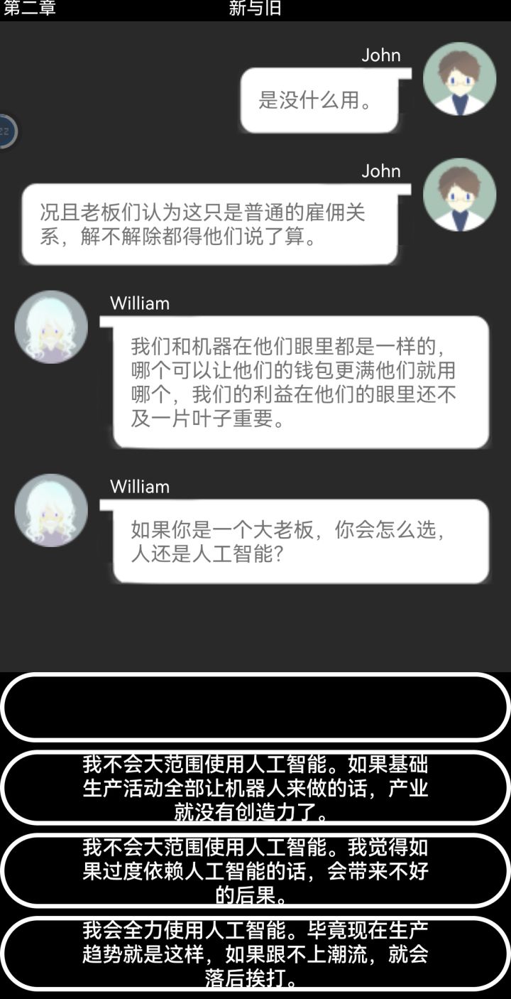 我只玩了前三章,主要是里面的对话不太能完全体现出我的想法。 我支持ai技术的发展,但也明白又会有大批量的人因此失业,但这样我们就不发展了吗?有了汽车我们不再需要马车,为了保住车夫所以就不该有汽车吗? 仔细想想,汽车的出现又带来了新的行业,汽车司机。再仔细想想,是不是在某种程度上也是人为了汽车去服务,本来汽车的出现是便利人的 所以对于这点,没有一个对话我满意,我的乐观来源于新事物
