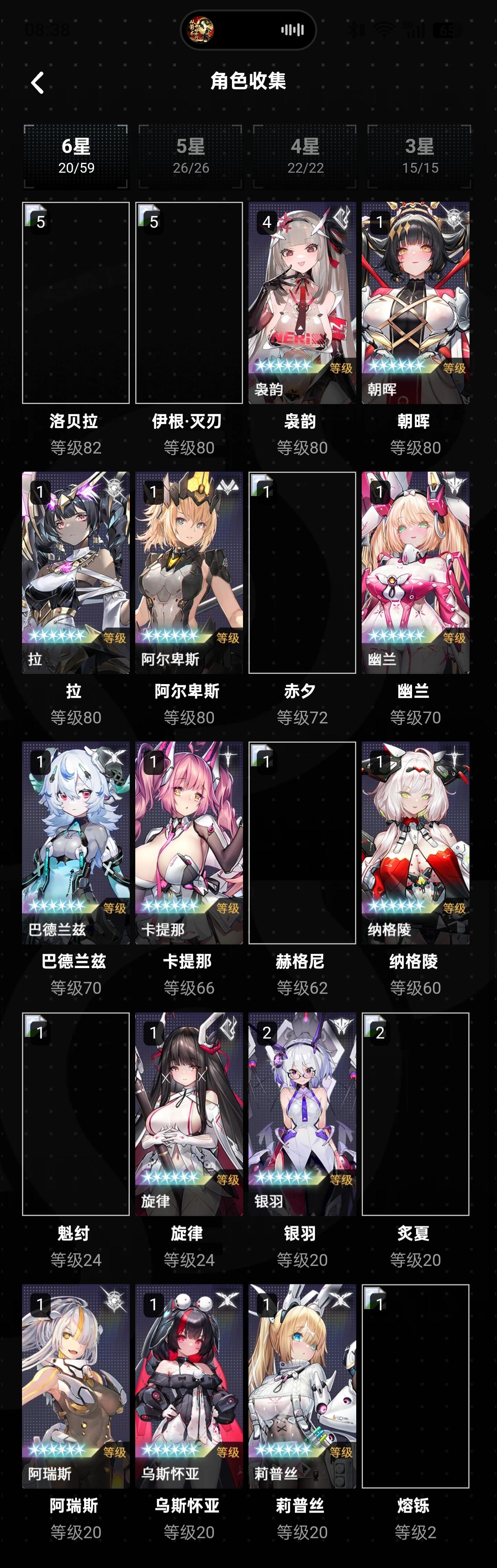 赫格尼版本入坑,当时抽了本体停手,新手自选齿髓配的六星是阿尔卑斯,没刷出巴德加齿髓,陆续补了乌琳琶音 歪的杜兰凑了开荒队,玩到二周年抽了五特洛贝拉(比较黑250抽),乌琳歪到3特(感觉提升不大,后来大佬提醒才知道还会乱轴),歪了CCC 绯利 这些,感觉现在配的一队推主线还行,体力在攒着等活动,到4章困难感觉没啥问题(实测到4-9有点扛不住了,打不满星),自选箱子没开,想补反击队无从下手,差的角色和