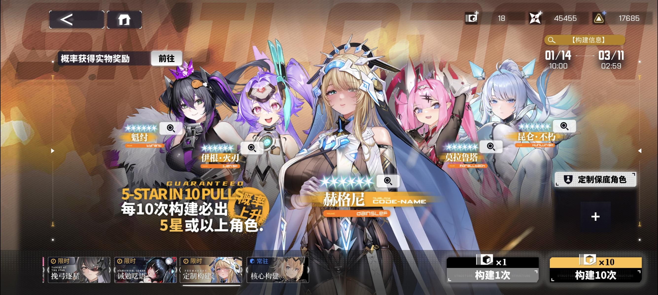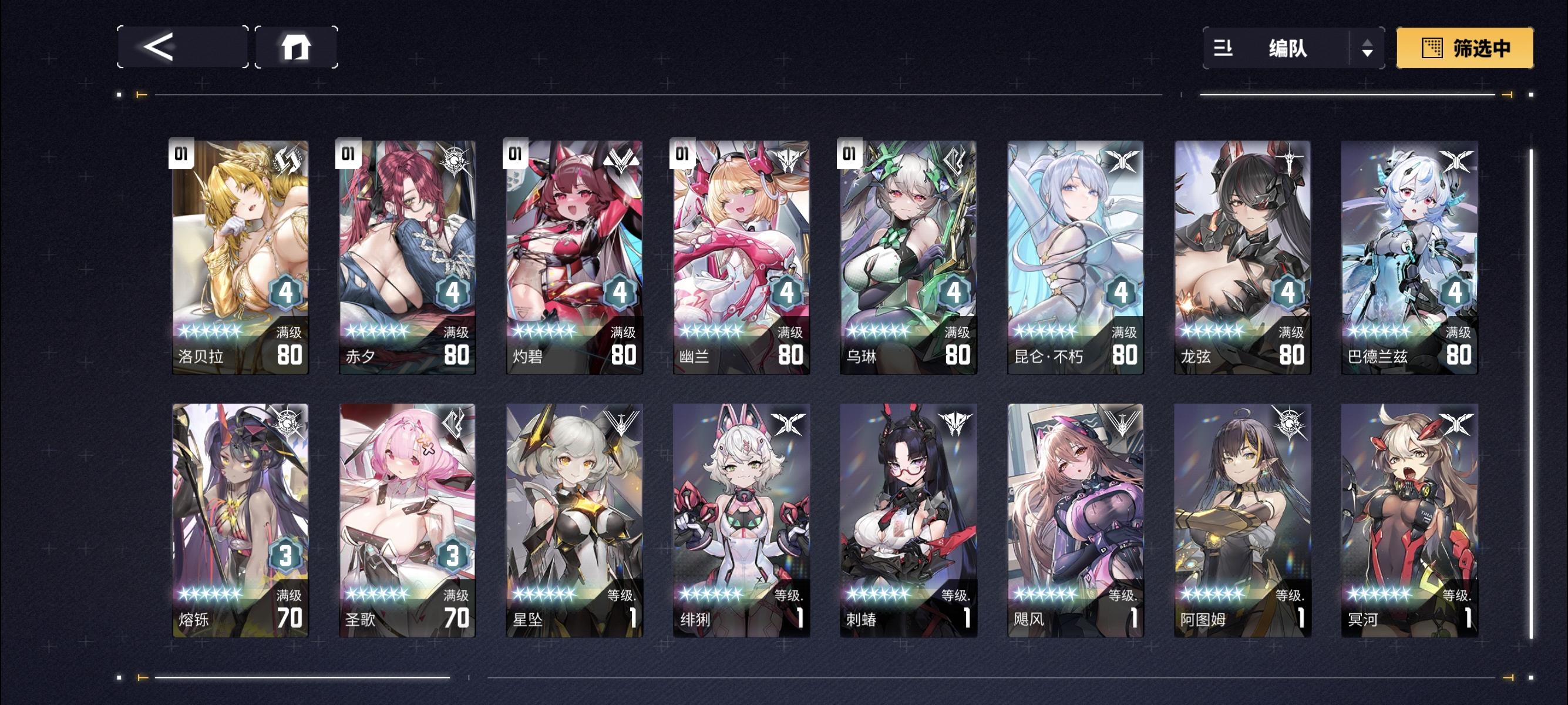 赫格尼版本入坑,当时抽了本体停手,新手自选齿髓配的六星是阿尔卑斯,没刷出巴德加齿髓,陆续补了乌琳琶音 歪的杜兰凑了开荒队,玩到二周年抽了五特洛贝拉(比较黑250抽),乌琳歪到3特(感觉提升不大,后来大佬提醒才知道还会乱轴),歪了CCC 绯利 这些,感觉现在配的一队推主线还行,体力在攒着等活动,到4章困难感觉没啥问题(实测到4-9有点扛不住了,打不满星),自选箱子没开,想补反击队无从下手,差的角色和