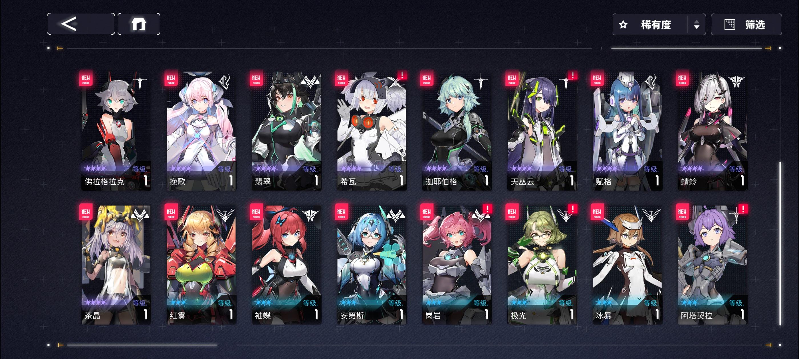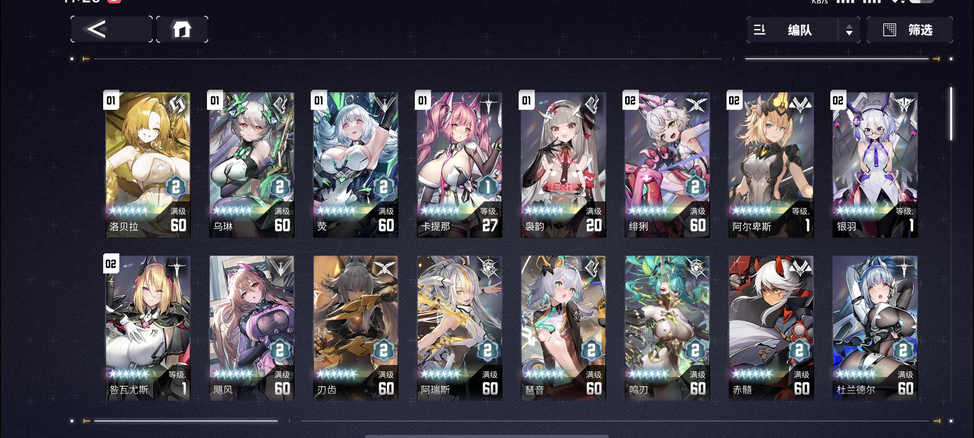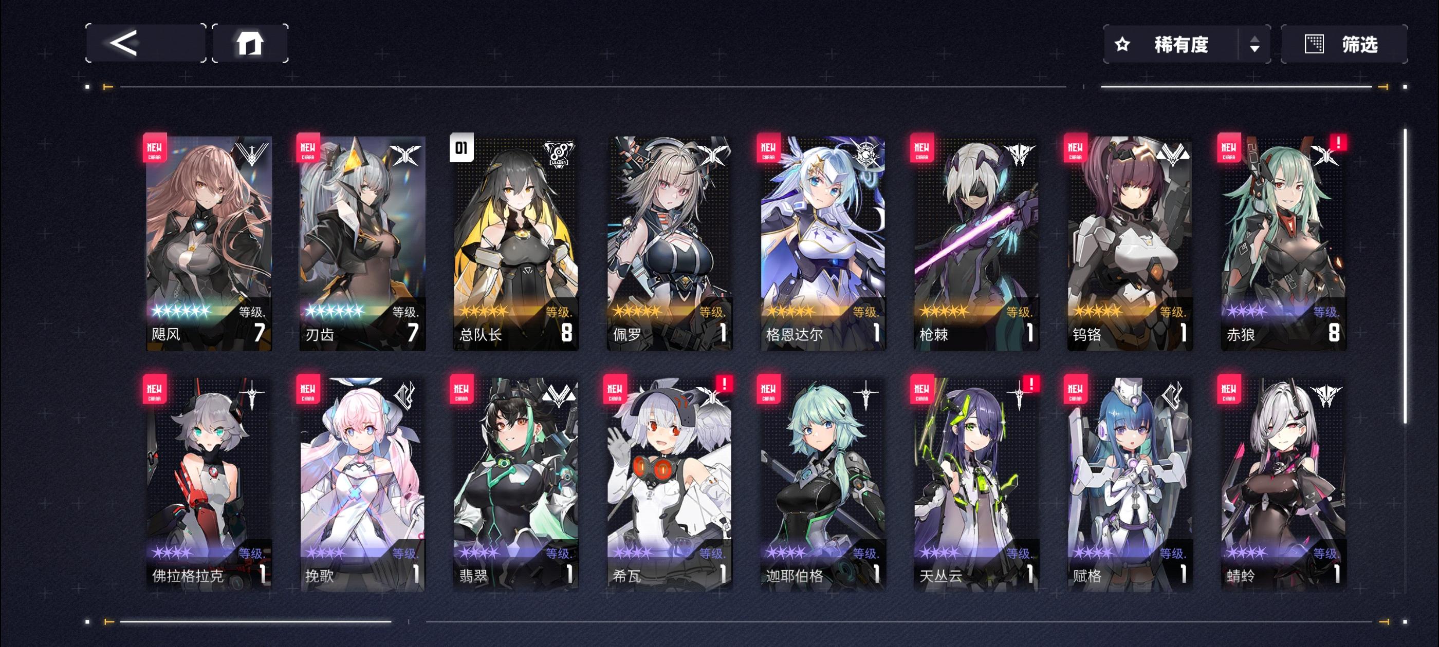 赫格尼版本入坑,当时抽了本体停手,新手自选齿髓配的六星是阿尔卑斯,没刷出巴德加齿髓,陆续补了乌琳琶音 歪的杜兰凑了开荒队,玩到二周年抽了五特洛贝拉(比较黑250抽),乌琳歪到3特(感觉提升不大,后来大佬提醒才知道还会乱轴),歪了CCC 绯利 这些,感觉现在配的一队推主线还行,体力在攒着等活动,到4章困难感觉没啥问题(实测到4-9有点扛不住了,打不满星),自选箱子没开,想补反击队无从下手,差的角色和