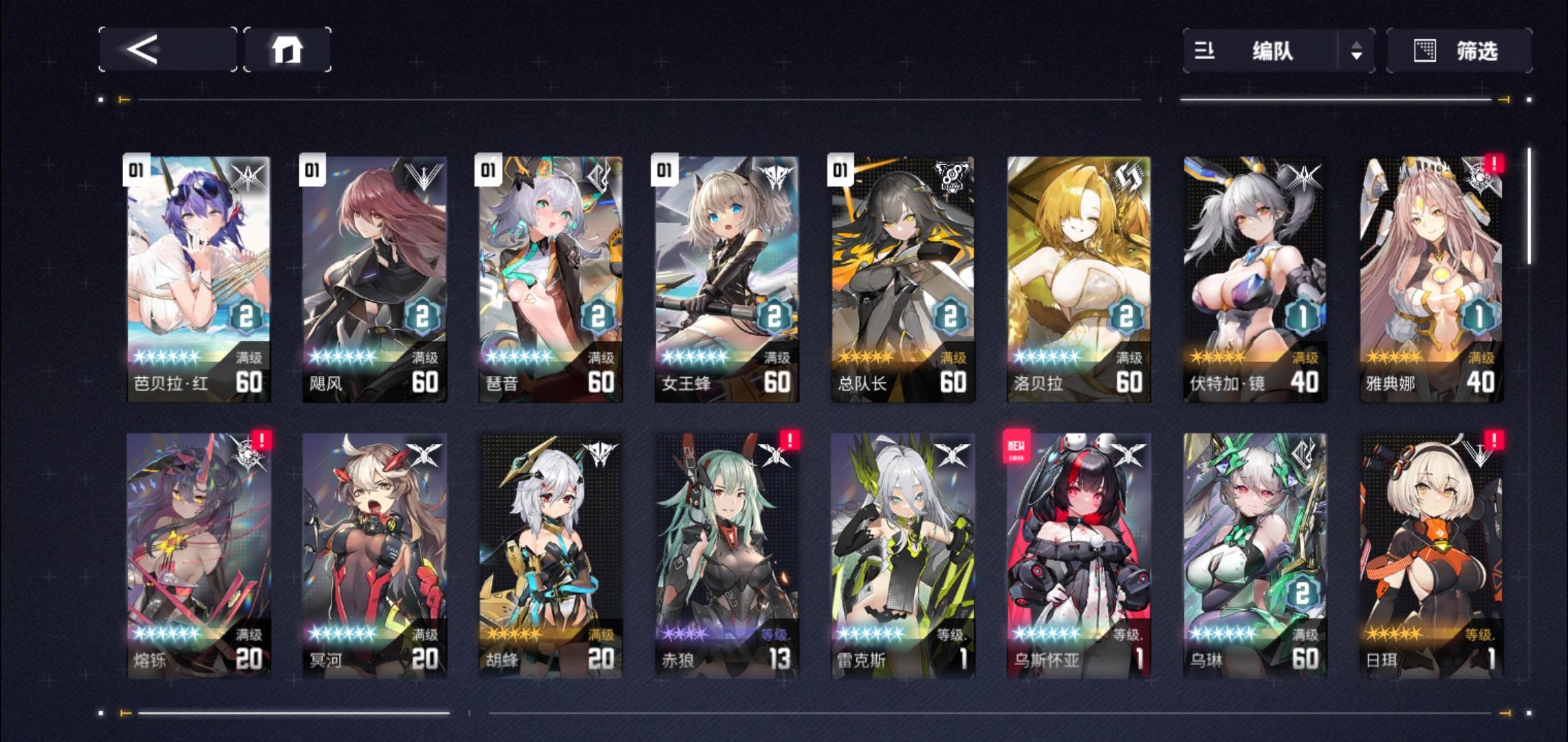 赫格尼版本入坑,当时抽了本体停手,新手自选齿髓配的六星是阿尔卑斯,没刷出巴德加齿髓,陆续补了乌琳琶音 歪的杜兰凑了开荒队,玩到二周年抽了五特洛贝拉(比较黑250抽),乌琳歪到3特(感觉提升不大,后来大佬提醒才知道还会乱轴),歪了CCC 绯利 这些,感觉现在配的一队推主线还行,体力在攒着等活动,到4章困难感觉没啥问题(实测到4-9有点扛不住了,打不满星),自选箱子没开,想补反击队无从下手,差的角色和