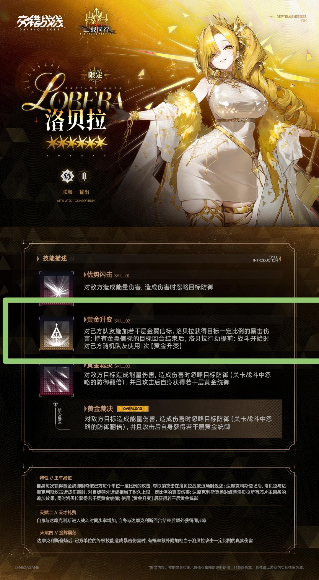 洛贝拉,属于新阵营【联域】,可召唤机神,更多角色详情可左转官方发帖。以下仅代表个人观点,欢迎一起交流。先来简单总结一下,绝对的输出角色。洛贝拉技能比较简单,主要的机制集中在特性里。——可夺取队友一定比例的攻击力。从介绍来看,可多次夺取,可能是【当前攻击力的百分比】,且因为退场之后会返还,所以该部分攻击必须是永久的,临时增加部分不计算在内,像【伊根、提尔锋、赫格尼】等永久增长的攻击力可被夺取。但