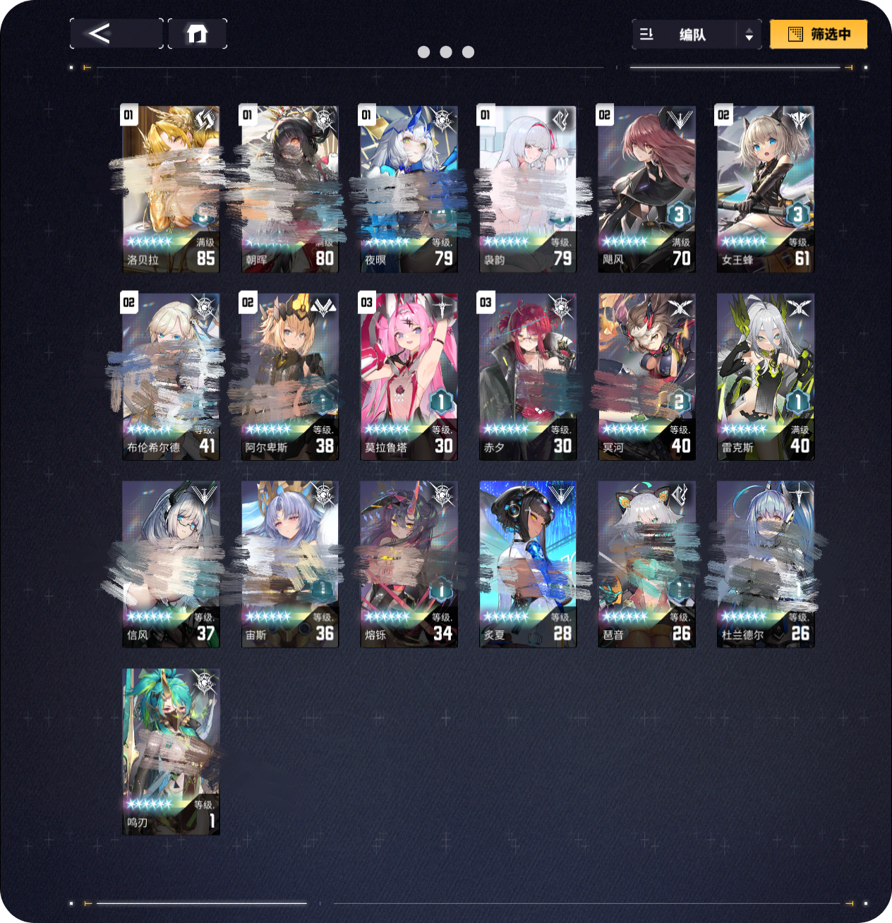 赫格尼版本入坑,当时抽了本体停手,新手自选齿髓配的六星是阿尔卑斯,没刷出巴德加齿髓,陆续补了乌琳琶音 歪的杜兰凑了开荒队,玩到二周年抽了五特洛贝拉(比较黑250抽),乌琳歪到3特(感觉提升不大,后来大佬提醒才知道还会乱轴),歪了CCC 绯利 这些,感觉现在配的一队推主线还行,体力在攒着等活动,到4章困难感觉没啥问题(实测到4-9有点扛不住了,打不满星),自选箱子没开,想补反击队无从下手,差的角色和