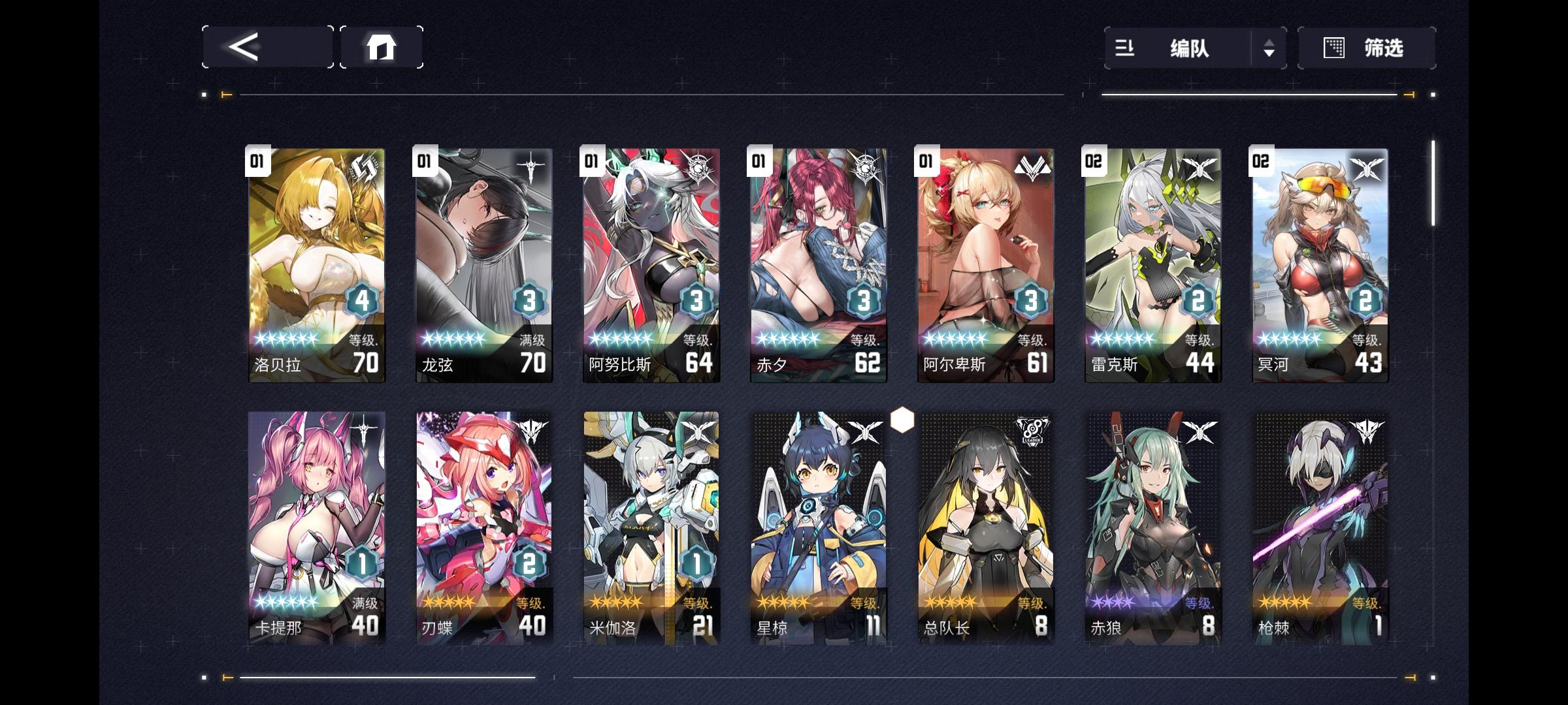 赫格尼版本入坑,当时抽了本体停手,新手自选齿髓配的六星是阿尔卑斯,没刷出巴德加齿髓,陆续补了乌琳琶音 歪的杜兰凑了开荒队,玩到二周年抽了五特洛贝拉(比较黑250抽),乌琳歪到3特(感觉提升不大,后来大佬提醒才知道还会乱轴),歪了CCC 绯利 这些,感觉现在配的一队推主线还行,体力在攒着等活动,到4章困难感觉没啥问题(实测到4-9有点扛不住了,打不满星),自选箱子没开,想补反击队无从下手,差的角色和