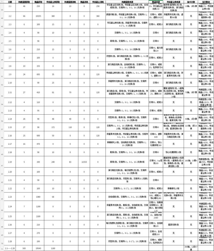 2月共获取365抽,19540微晶(130.26抽)总计495抽。1180传说星尘券。共进行了390次抽卡,出了12个彩47个黄。#交错战线迎春序