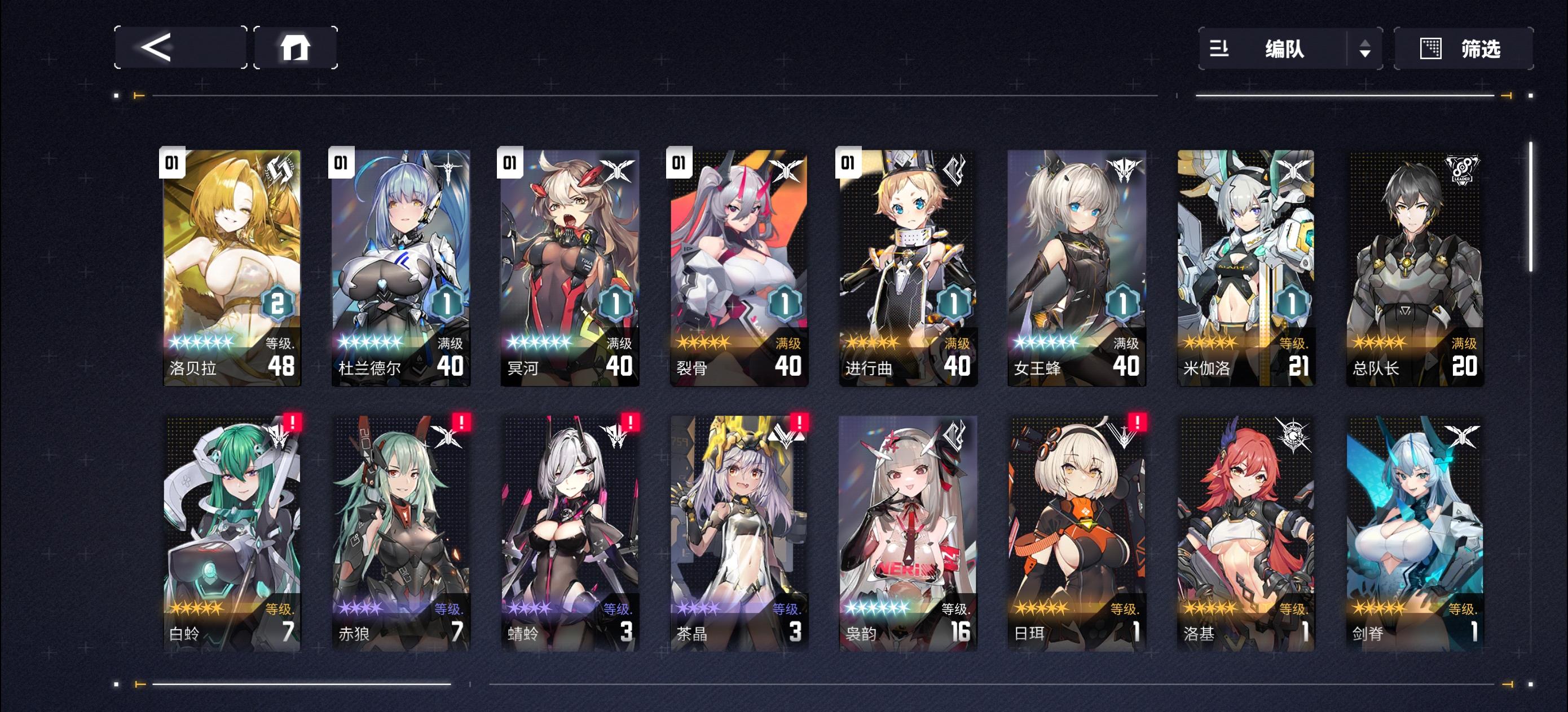 赫格尼版本入坑,当时抽了本体停手,新手自选齿髓配的六星是阿尔卑斯,没刷出巴德加齿髓,陆续补了乌琳琶音 歪的杜兰凑了开荒队,玩到二周年抽了五特洛贝拉(比较黑250抽),乌琳歪到3特(感觉提升不大,后来大佬提醒才知道还会乱轴),歪了CCC 绯利 这些,感觉现在配的一队推主线还行,体力在攒着等活动,到4章困难感觉没啥问题(实测到4-9有点扛不住了,打不满星),自选箱子没开,想补反击队无从下手,差的角色和