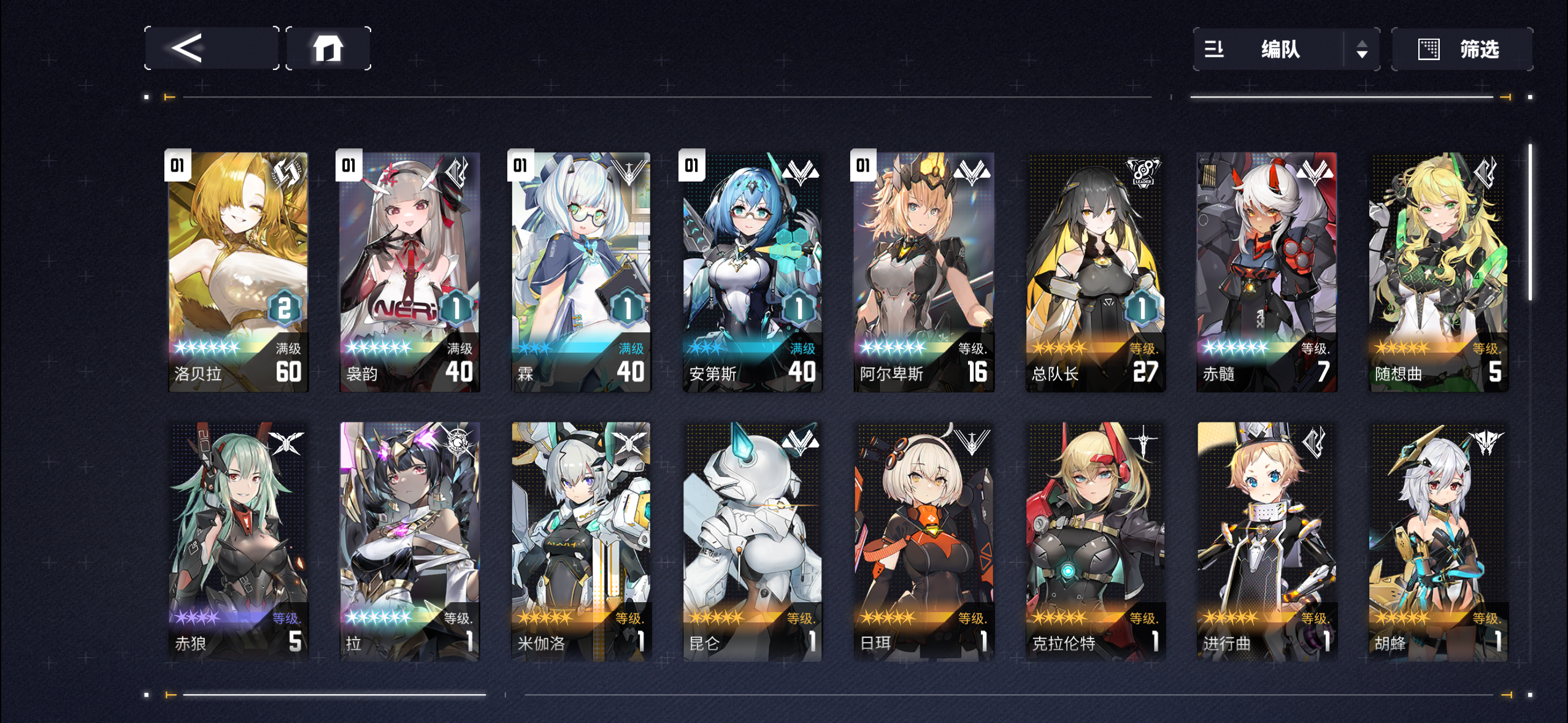 赫格尼版本入坑,当时抽了本体停手,新手自选齿髓配的六星是阿尔卑斯,没刷出巴德加齿髓,陆续补了乌琳琶音 歪的杜兰凑了开荒队,玩到二周年抽了五特洛贝拉(比较黑250抽),乌琳歪到3特(感觉提升不大,后来大佬提醒才知道还会乱轴),歪了CCC 绯利 这些,感觉现在配的一队推主线还行,体力在攒着等活动,到4章困难感觉没啥问题(实测到4-9有点扛不住了,打不满星),自选箱子没开,想补反击队无从下手,差的角色和