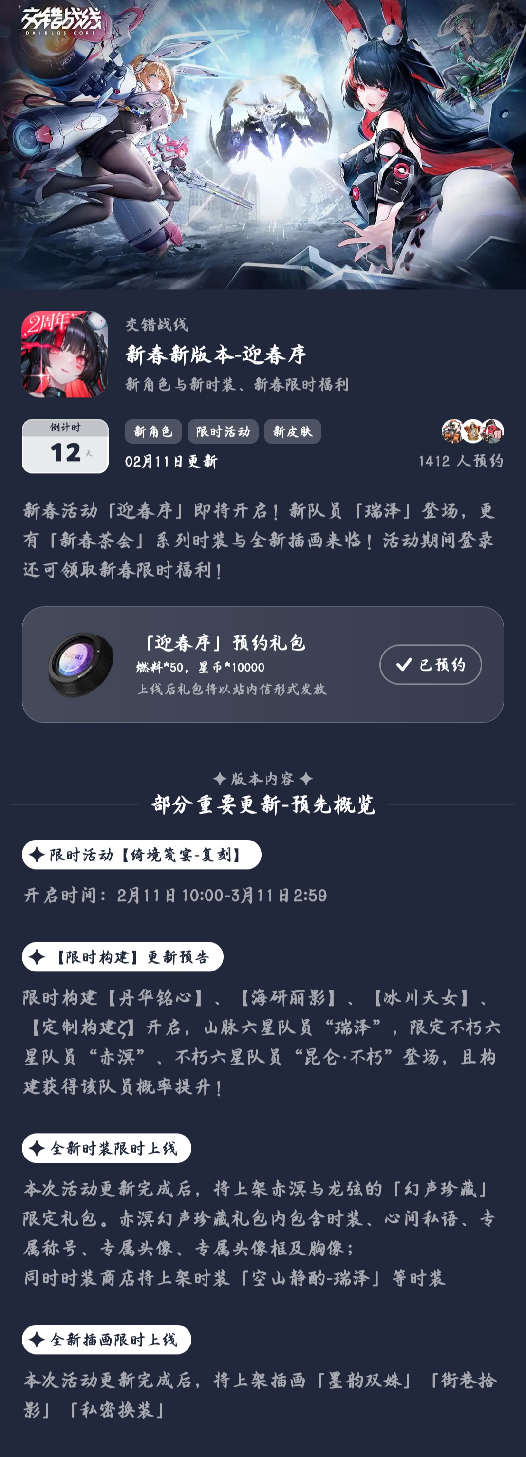 牢交新版本预约出来啦!赤溟大人带着她的心间私语来啦,龙弦-心间私语复刻!新角色-山脉阵型-瑞泽,单纯从名字来看,像是个辅助,期待(✧◡✧)!#交错战线