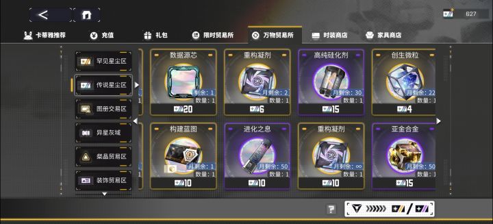 给最近入坑的萌新们做的一篇商店兑换指南图1️⃣——黄票商店初级硅化剂为必换,建议兑换前五次微晶和第一张构建蓝图。(存到后期黄票很多的话可以继续换构建蓝图)图2️⃣——彩票商店!!!!!!构建蓝图一共有很多轮,一定要存到1098张彩票再换!!!!!!图3️⃣——紫票商店一定要优先换区彩票、高级硅化剂和进化之息,如果有足够的体力刷彩票就可以安装上图的方式兑换,总队长星源优先级