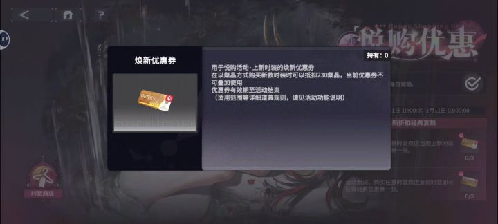 交错26新年活动之一,皮肤优惠券,在主页右上角处《悦购优惠》有具体说明,怕你错过里面还包含了日常签到,每日登录会有红点显示。优惠券分为焕新优惠券和经典优惠券。焕新优惠券只能用于有“上新”标识的皮肤。经典优惠券只能用于返场皮肤。两种优惠券均等效230粲金,都需要先购买一款启动,注意⚠️第一款皮肤是没有优惠的,购买以后会自动领取,并在下一款皮肤购买中自动使用。简单来说第二款皮肤开始优惠230