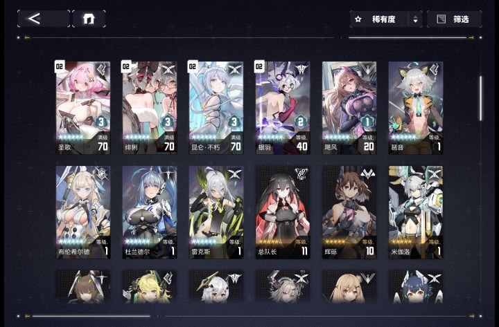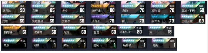 周年末尾入坑,除了富婆五特,其他都是图签,想凑一个二队培养一下活动结束前把塔前十层微晶拿上就行