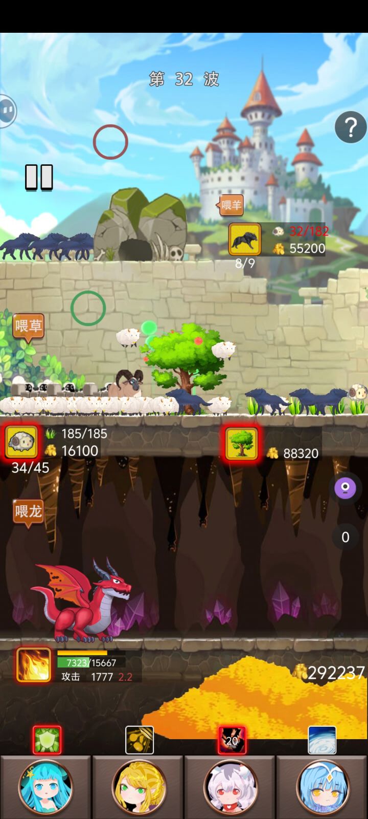 后期的自动喂草会因为没羊停止,需要手动喂草到一定数量的羊出现。喂狼会显示没有适合的羊(还要等羊长大是吧)。感觉后期顶不住,点击倒计时提前挑战有金币奖励,好家伙算上前面的问题我疯狂点击喂羊拖羊喂狼点击喂龙还要看技能CD。我人没了