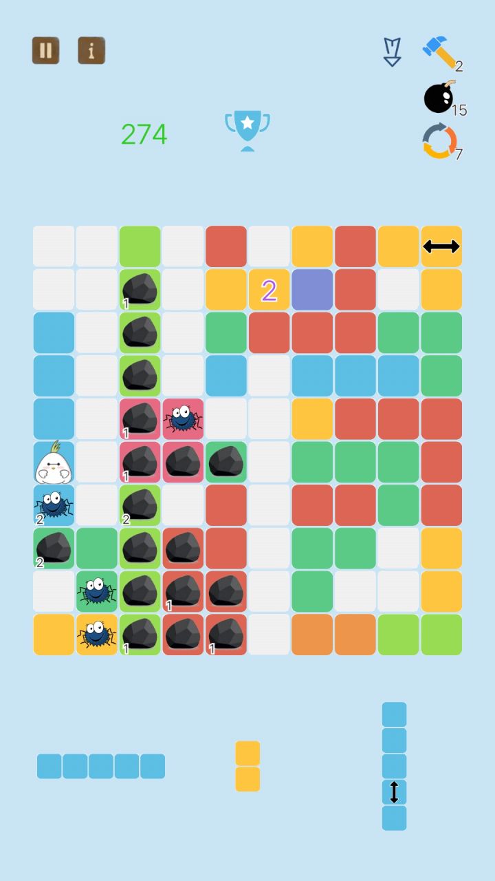 修改了方块的随机概率,几乎很小概率出现两个3*3的方块了,同时出现三个?如果是,你可以去买彩票了。哈哈哈。在下个版本就会更新。希望大家喜欢,有什么建议都可以留言,您的支持是我前进的动力,谢谢大家。另外,正准备开始做一款新游戏。加油加油。