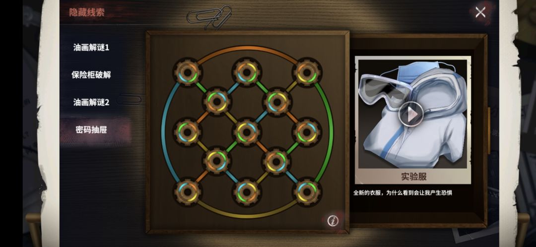 1、搜证:2油画,2齿轮,显示屏,监控,日历,门,地板,墙壁密码锁,屏幕。 2、0908,没有,观察时间,5分钟,制止,关于地面,反对他的做法,我想知道原因。 3、搜证:电箱,墙壁,灯,时钟,出口。 4、代替她去。 5、搜证:墙壁,灯,时钟。 6、SWAP,帮忙,情感,当年的受害者。 7、搜证:1油画,通风管道,壁画,门。 8、搜证:通风口,灯,地面,四周。 9、1124。 10、搜证:2齿轮,娃