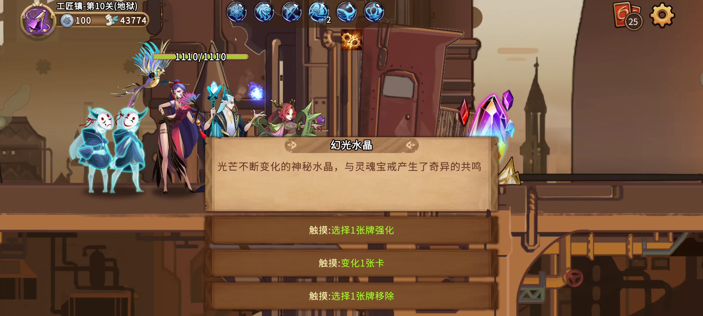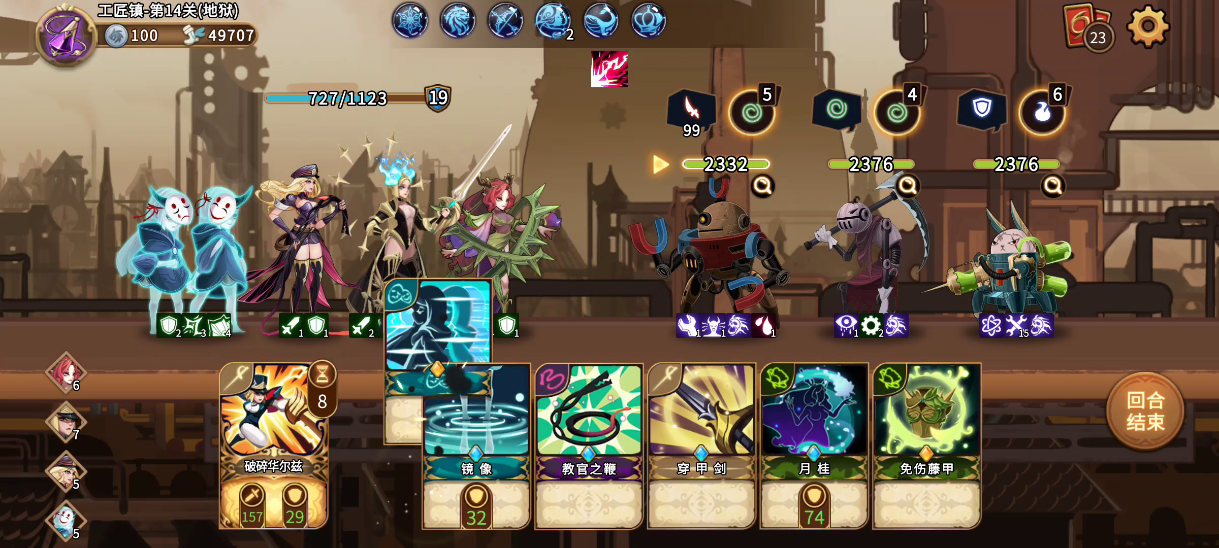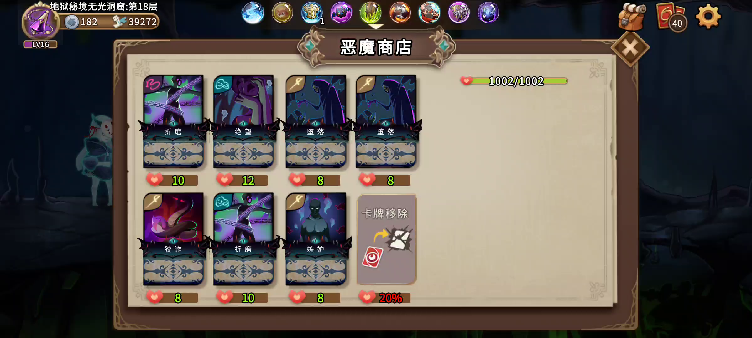 地狱-工匠镇-第14关 嘲讽+无效化+破坏+残血无敌 穿甲剑+惩戒+三角斩+镜像(抵消破坏)+免伤藤甲+虚实权杖; 按顺序排了一下核心牌,别的牌尽量别打,都卖给它们吧…… 穿甲剑+惩戒+三角斩,叠攻+输出的首选; 双子双生+藤甲,保命,复制穿甲剑稍稍有点卡手; 虚实权杖……前3回合打还行,不然牌都没了,没啥用了,不如卖了吧…… 追势对牌序要求高,牌库残了就打不起来了。这里破坏意图被嘲讽保护了2次,追势来不及砍稻草人,牌库就报废了。 这里带了追势×2+折光之手+三角斩;把追势换成三角斩+破空斩,这样抽牌快,三角斩也可以卖1张,感觉这样的话表现会更不错吧。 双姝可以多带1张镜像吧,刷开局第2回合虚实权杖就行了,不刷问题也不大。 法王+夜莺应该更水银泄地一点吧……
