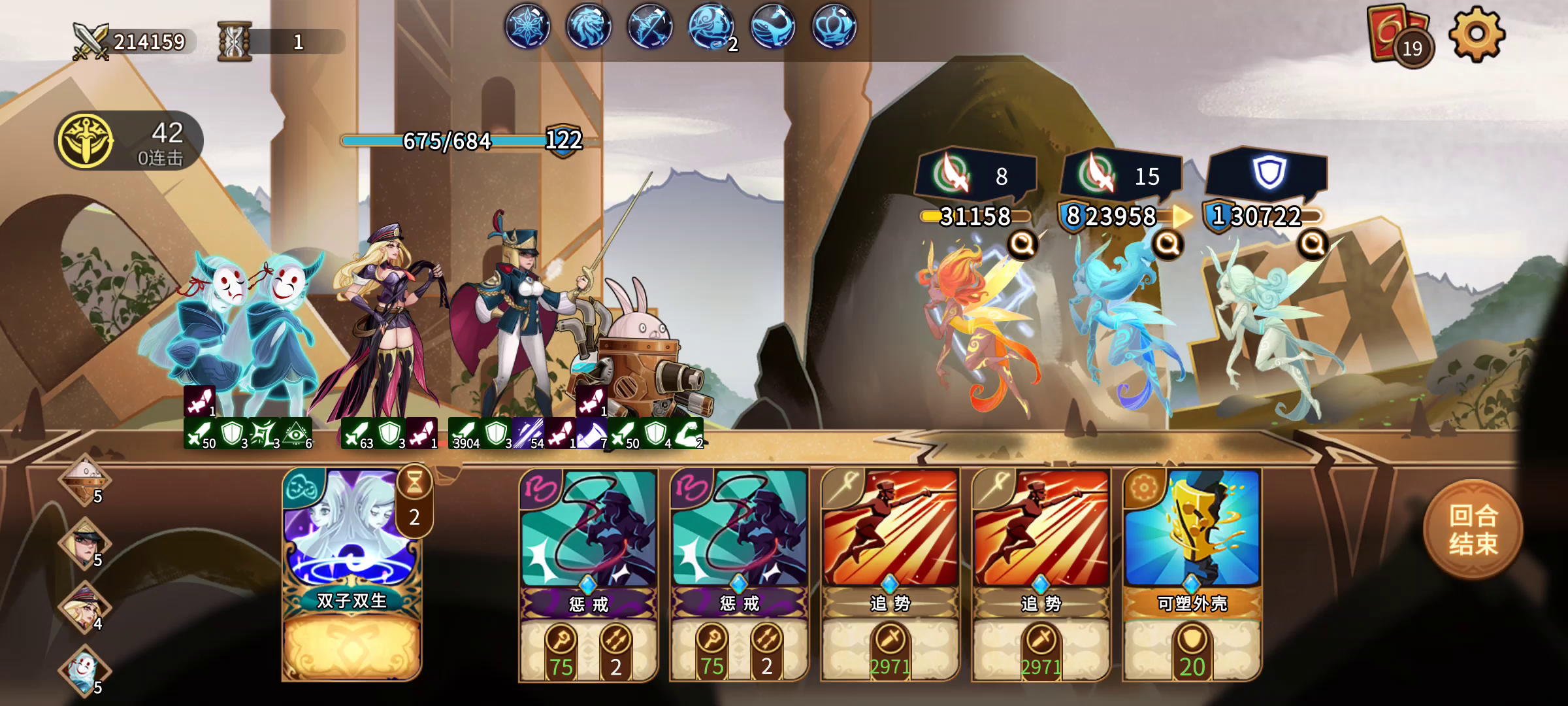 双姝:虚实法杖+镜像+幻灵; 简:追势×2+穿甲剑; 凌:惩戒×2+消耗牌; 坦克随意……这自走炮等级太低没用上…… 这里双姝大招复制了穿甲剑一次,一共三张穿甲剑。理论上穿甲剑多多益善,但这里用3张就够了。因为还有回合限制和大招轮换,5张穿甲剑应该差不了多少。 简主要依靠追势一进一出加攻击,凌给对面上甲。 对等级星级啥的没有特别的要求……