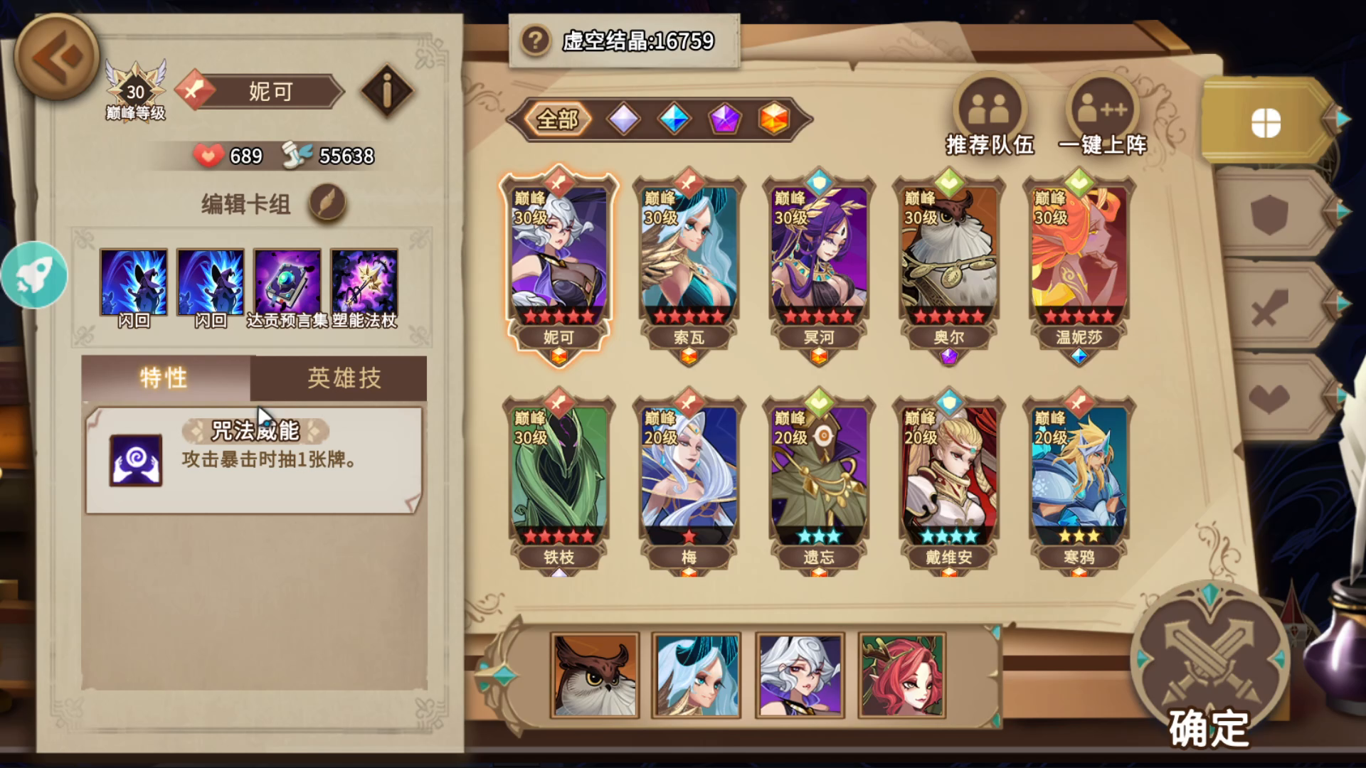 话唠主教给你讲故事…… 牌可以慢慢打…… 但故事要认真听…… 这里双姝、蔷薇上60了…… 所以免伤甲最后没打出去…… 理论上55级免一回合伤害是能打的…… 没有金装,都是紫装和蓝装… 秘境也是这队伍,拿了三穿甲剑三免伤甲
