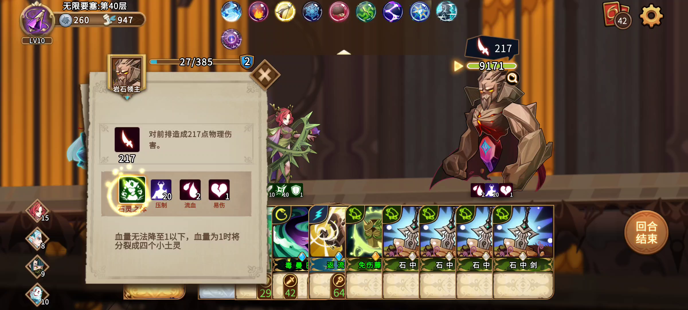 纯萌新,30级打到无限要塞41层。 就是以300血打一万多血的怪物,伤害压制26%+,还有速度压制。 后面怪物的速度压制先手和免伤和伤害加成,开局碰一下我就死了。 打法也很简单,拔出石中剑后疯狂复制石中剑,然后依靠镜像的双倍复制,复制抽卡的牌,然后疯狂抽卡,疯狂补牌,用完了再石中剑,石中剑用得差不多了再用双子复制石中剑,来回套娃。 如果不是怪物先手压制,基本上没有打不过的boos,有滕甲无敌反伤啥的也不怕😁