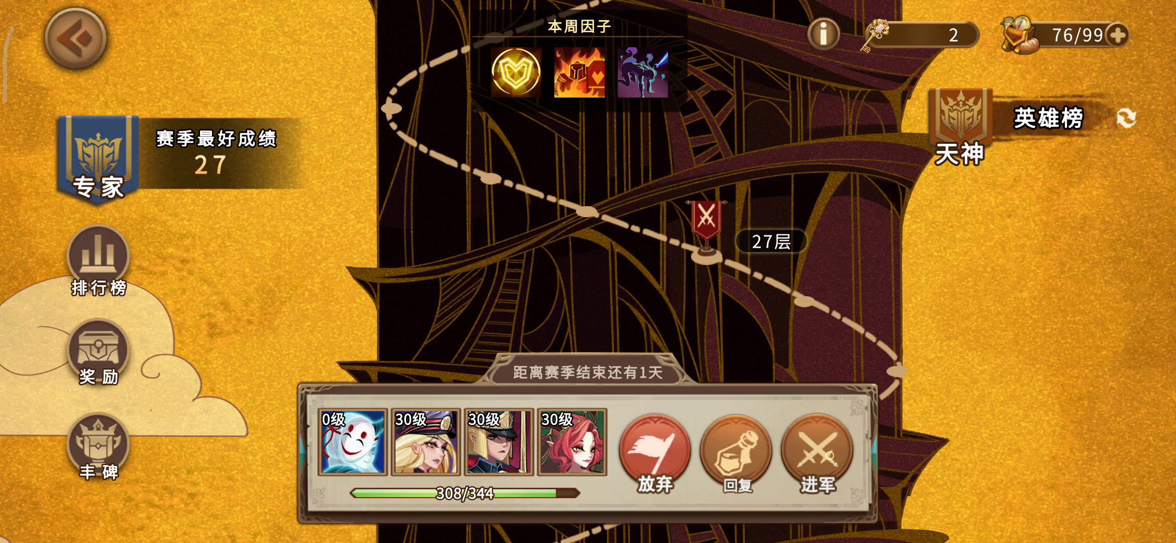 蔷薇卡池保持好 酒神加暴击 加百列爆发 范海辛迅捷